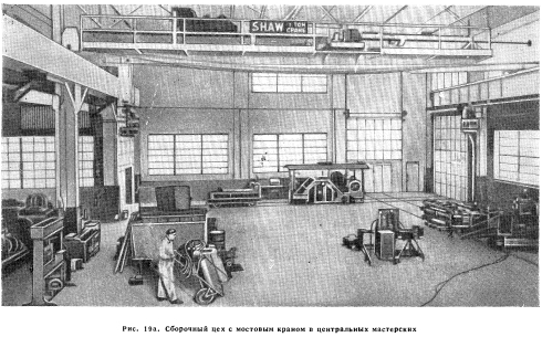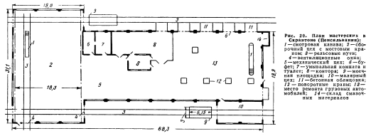 ЦЕНТРАЛЬНЫЕ МАСТЕРСКИЕМного лет назад на большинстве дорог ремонт моторных дрезин, вагонов-травосжигателей, поливочных вагонов копров на рельсовом ходу для забивки свай, мостовых кранов, путевых стругов, экскаваторов на рельсовом ходу, жилых вагонов и другого оборудования для содержания и ремонта пути производился в общих мастерских отделов механизации дорог по ремонту подвижного состава. Это было логично, поскольку почти все путейские механизмы, как и подвижной состав, передвигались по рельсовой колее. Однако в этих мастерских первоочередными работами был ремонт подвижного состава, а ремонт путевых машин и механизмов стоял на втором плане и поэтому не всегда производился вовремя и по качеству не во всех случаях удовлетворял путейцев, В связи с этим ряд дорог организовал в наиболее необходимых местах районные мастерские для ремонта моторных дрезин силами механиков, специально обученных этому виду ремонта. С течением времени дороги начали приобретать все большее количество механизмов, особенно с бензиновыми двигателями. Это оборудование в основном поступало для ремонта в районные мастерские по ремонту моторных дрезин, а также и в мастерские отделов механизации. В последние в основном поступало оборудование на рельсовом ходу, которое ремонтировалось в соответствии с техническими условиями Ассоциации американских инженеров на ремонт вагонов. Такая организация ремонта в течение ряда лет устраивала путейцев. Однако в настоящее время дорогами приобретается такое большое количество механизмов, что районные мастерские уже не могут справиться с их ремонтом. Кроме того, отдельные виды ремонта не могут быть выполнены в районных мастерских из-за отсутствия в них соответствующих инструментов и оборудования. Поэтому значительная часть механизмов, подлежащих ремонту, передавалась по повышенным ценам в коммерческие мастерские. В этот же период многие дороги стали приобретать для путевых бригад автомобили, которые для регулировки и ремонта начали направлять в местные гаражи. В связи со все большим поступлением автомобилей для большинства дорог стала совершенно очевидной необходимость устройства собственных гаражей, оборудованных необходимым инструментом и станками для наладки и ремонта автомобилей. Это подтверждалось тем, что дороги, построившие такие гаражи, начали получать большую экономию. В настоящее время наметилась общая тенденция устраивать для ремонта всего оборудования на дорогах центральные мастерские и небольшие районные и участковые мастерские, в которых механики, работающие на линии, могли бы производить текущий ремонт механизмов. Механики, работающие в линейных мастерских, должны иметь опыт работы с машинами, а работники центральных мастерских, кроме того, — высокую квалификацию. Центральные мастерские должны быть оборудованы соответствующими специализированными станками и измерительной аппаратурой. Планировка центральных мастерских. Центральные мастерские для ремонта оборудования должны быть удобно расположены по отношению ко всем главным направлениям дорог; желательно их устраивать на станциях с остановками всех пассажирских поездов для того, чтобы иметь возможность быстро доставлять отдельные необходимые. детали в путевые бригады и в районные мастерские. Желательно также иметь
