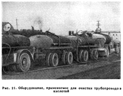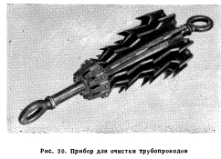ЧИСТКА ВОДОПРОВОДНЫХ МАГИСТРАЛЕЙПониженная пропускная способность водопроводных магистралей из-за налета в трубах, раковин, органических наростов, коррозии и отложений извести является одной из главных проблем при растущих требованиях в воде. Это особенно относится к старым зодопроводным магистралям, которые подвергаются большему напряжению даже при неполной пропускной способности. Только один срок службы не определяет пропускную способность трубопровода, так как нужно учитывать еще ряд других факторов (рис. 19). Понижение пропускной способности можно объяснить образованием корки накипи на внутренних стенках трубы в результате реакции горячей воды, вызванное чрезмерной обработкой воды известью или от коррозии, которая разрушает металлическую отливку трубы и влияет на незащищенный металл. Понижение пропускной способности труб может также возникнуть в результате образования в них органических наростов. Одним из наиболее рациональных методов чистки длинных линий трубопроводов является чистка труб на месте трубоочистительными механизмами (рис. 20), которые протаскивают через трубы. Там, где давление допускает эксплуатацию трубопровода, чистка труб производится следующим образом. Магистраль вскрывают в двух местах и с одной стороны в нее вводят очиститель. Затем это отверстие закрывают и под давлением воды очиститель двигается внутри трубы. Все посторонние материалы двигаются перед очистителем по трубам и выталкиваются из них частью воды, двигающей очиститель. Когда налеты внутри трубы очень твердые или если этого требуют условия работы, то вначале через трубу протягивают трос, прикрепляют к его концу очиститель и затем при помощи лебедки протягивают через трубу трос вместе с очистителем, в то же время давление воды размывает посторонние материалы, разрыхленные головкой очистителя. Чистка магистральных трубопроводов требует специального оборудования, поэтому считается более целесообразным заключать контракты на чистку водопроводов со специалистами в этой области. ![]() Время, затрачиваемое на чистку водопроводов, сравнительно невелико. Трубопровод длиной 4,8 км с диаметром труб 406,4 мм можно очистить за б ч с момента выключения воды до возобновления работы трубопровода. Сплошную чистку труб можно производить со скоростью 15,24—18,28 м/мин на участках трубопровода длиной от нескольких десятков метров до нескольких километров. Механизированная чистка трубопроводов восстанавливает пропускную способность на 95% и более. Применяются также химические вещества, такие, как соляная кислота. Соляная кислота уничтожает налет углекислого кальция, образовавшегося при обработке воды или от естественных вод, в частности при перегонке воды в паровые котлы по питательным линиям трубопровода. Кислоты широко применяются при чистке коротких линий трубопровода (рис. 21). ![]() В настоящее время для очистки трубопроводов имеется много типовых кислотных соединений, причем каждое из них применяется в отдельных соответствующих случаях в зависимости от веществ, засоривших трубопровод. Что кагается механического способа очистки трубопроводов, то положительные результаты были достигнуты специалистами, имевшими необходимое оборудование и опыт. Ручную очистку труб можно применять там, где налет сравнительно мягкий. Муть, осевшая 