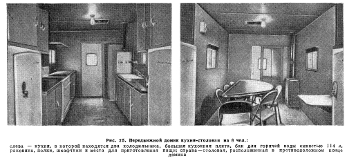 ДВА ТИПА ДОМИКОВ НА АВТОМОБИЛЬНЫХ ПРИЦЕПАХНа железных дорогах имеются два типа передвижных домиков. К первому типу относятся комплексные передвижные домики, а ко второму — специализированные домики. Комплексные домики оборудуются, как и обыкновенные жилые дома. В них предусмотрены: кухня, место для столовой, ванная, туалет и помещение со спальными местами. В домиках имеются кухонные плиты, холодильники, раковины, кипятильники и отопительные приборы. Такими обычно бывают передвижные домики, изготовляемые фирмами для продажи населению. Некоторые фирмы изготовляют передвижные домики специально для железных дорог из расчета размещения в них 4—5 чел. Специализированные передвижные домики сконструированы таким образом, что каждый такой домик имеет специальное назначение, например; домик-кухня, домик- столовая, домик-спальня, или в одном домике иногда расположены кухня и столовая. В домике-кухне может быть жилая комната для повара, а в домике-конторе — жилая комната для 2 чел. и помещение для хранения оборудования. Специализированные передвижные домики используются для бригад численностью более 5 чел., когда их нельзя разместить в одном домике. В таких случаях разделение функций между различными домиками становится очевидным. С помощью таких домиков можно обеспечить жилье для бригад любой численности. Передвижные домики для железных дорог должны быть прочными и иметь длительный срок службы. По мнению одной фирмы, это особенно важно для домиков, приобретаемых дорогами для опытного ознакомления с их эксплуатацией. Если дороги при опытной эксплуатации передвижных домиков будут иметь существенные трудности из-за их несовершенства, то они не оценят всех преимуществ этого вида жилья, о которых говорилось выше. Комплексные передвижные домики. Комплексные домики на автомобильных прицепах были первыми типами передвижных домиков, которые начали применяться на железных дорогах. Это объясняется тем, что такие домики имелись в продаже и могли быть без особой переделки использованы для небольших бригад численностью от 2 до 4 и даже до 5 чел. ![]() Комплексные передвижные домики нашли наиболее широкое применение для жилья путевых и сварочных бригад численностью 2 чел. Такие домики очень удобны для размещения в них механиков машин, например бульдозеристов, механиков стругов, трактористов и др. В домиках можно удобно разместить бригады водопроводчиков, связистов, электриков и небольшие бригады по ремонту мостов и строительного оборудования. На многих дорогах большинство таких бригад обеспечено автомобилями для передвижения их с одного места работ на другое и для перевозки необходимого оборудования и материалов. Поэтому на этих дорогах не приходится вкладывать значительные капиталовложения на приобретение автомобилей, если эти бригады будут размещены в подвижных домиках. Стоянки комплексных передвижных домиков обычно располагаются около пассажирских станций для того, чтобы было возможно подключиться к водопроводной и электрической сети. Для этой цели домики снабжены длинными шлангами для воды и электрической подводкой. В некоторых случаях приходится устраивать стоянки передвижных домиков в отдаленных пунктах, где нет электроэнергии и водопровода. В таких случаях вода должна подвозиться в водяных цистернах, а электрическ