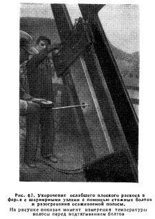 ЭКСПЛУАТАЦИЯ МОСТОВВ связи со сравнительно большим сроком службы металлических мостов их содержание требует в общем большей затраты сил, чем сооружение. Состояние металлических пролетных строений необходимо проверять не реже 1 раза в год, причем все признаки быстрого износа и разрушения надо внимательно обследовать и фиксировать. Текущие обследования. При обследовании моста необходимо систематически осматривать все его части с тем, чтобы своевременно обнаружить наличие дефектов или такого состояния, которое, не будучи исправлено, способно привести к снижению безопасности сооружения. При наличии условий, создающих непосредственную угрозу безопасности сооружения, необходимо немедленно принять меры, требуемые обстановкой. В подобных случаях надлежит безотлагательно поставить в известность о положении инженера по мостам и непосредственно заинтересованные стороны. Другие дефекты, требующие устранения, следует отметить для включения в план работ следующего года. При обследовании пролетных строений с фермами на болтах-шарнирах необходимо проверять возможность ослабления болтов и контргаек, а также износа шарниров и листов с отверстиями. По возможности, обследование следует проводить при движении поездов. При обследовании опираний пролетных строений необходимо обращать внимание на положение и состояние кладки, надежность заанкеривания, работу подвижных опорных частей, отсутствие препятствий продольным перемещениям конструкции (наличие достаточного зазора у ее конца). Если при этом будут обнаружены какие-либо ненормальности, необходимо проверить, не имеются ли перемещения опор. Если наблюдениями установлено наличие таких перемещений, то необходимо провести более углубленное исследование, чтобы установить, требуется ли принять меры по устранению дефектов. Усиление и ремонт. Для обеспечения наибольшей продолжительности службы существующих пролетных строений весьма важное значение имеют мероприятия по содержанию мостов в хорошем физическом состоянии и по приспособлению их к воспринятию обращающихся нагрузок. Необходимость усиления или ремонта таких сооружений может быть продиктована рядом причин: возрастанием веса и скоростей проходящих поездов, износом отдельных частей, повреждением атмосферными воздействиями. Характер потребного усиления и ремонта стального сооружения зависит от его конструкции, физического состояния, рода металла, действующих напряжений, условий габарита и других индивидуальных для данного сооружения условий. Ьолее подробное рассмотрение этого вопроса выходит за пределы настоящего справочника и содержится в ТУ AREA. Натягивание ослабших стержней с проушинами. В главных фермах с шарнирно-болтовыми узлами по истечении многих лет службы довольно часто наблюдается ослабление натяжения стержней за счет износа шарниров и проушин в местах соприкасания. Степень износа зависит от величины и характера загружения. При неодинаковом износе в различных узлах неравномерная работа отдельных элементов становится заметной. Ослабшие элементы ферм необходимо натянуть. Для этого применяют различные методы: а) натягиваемый стержень разрезают, в месте разреза ставят присоединенные к листам две стяжные муфты, которые приваривают или приклепывают к разрезанным концам стержня; б) стержень 