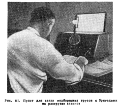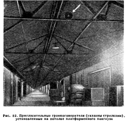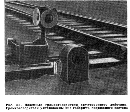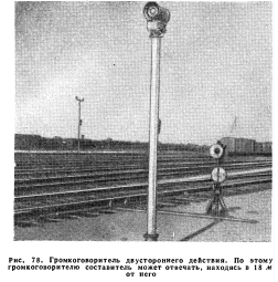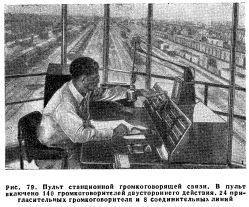 ГРОМКОГОВОРЯЩАЯ СВЯЗЬСтанционная громкоговорящая связь. Громкоговорящая связь на механизированных сортировочных горках. Связь осмотрщиков вагонов. Связь в перегрузочных пакгаузах Значительная часть аппаратуры, разработанной и применяемой в технике радиосвязи, как, например, микрофоны, электронные усилители и громкоговорители, широко используется в проводной громкоговорящей связи с непосредственным вызовом. Такая связь оборудуется на станциях, в парках, пакгаузах, а также в депо и цехах. Первые громкоговорящие установки были оборудованы в залах ожидания и на станционных платформах пассажирских станций. По громкоговорящим установкам пассажиры оповещались о времени прибытия и отправления поездов. Кроме того, по этим же установкам вызывались работники станций. Первая установка громкоговорящей двусторонней связи, по которой станционные работники вызывались для переговоров, была оборудована на станции Сан-Луи железной дороги Алтон Саутзерн в 1944 г. Подобную же установку оборудовала железная дорога Саутзерн на станции Бирмингам в 1945 г. С того времени такими системами оборудованы сотни станций на многих дорогах. Станционная громкоговорящая связь. Практически станционные громкоговорящие связи оборудуются примерно по одному и тому же принципу. Для организации такой связи на станции устанавливается большое количество громкоговорителей, из которых небольшая часть является мощными, со значительной зоной озвучивания и используемые исключительно для передачи сообщений и вызова персонала; значительно большая часть громкоговорителей маломощные, они используются для двусторонней связи между конторой и станционным персоналом (рис. 78). Эти двусторонние громкоговорители располагаются в пунктах пребывания станционных работников, с которыми дежурному по станции или парку необходимо вести переговоры. Так, например, громкоговорители устанавливаются: вдоль сортировочных путей, где производится расформирование и формирование поездов; в помещении осмотрщика вагонов и на путях ремонта вагонов; у входных и выходных стрелок; у вагонных весов; у льдохранилищ; в депо и во многих других точках. ![]() В помещении дежурного по станции, которое обычно размещается на втором этаже поста, устанавливается пульт связи с наклонной панелью, на которой размещаются ключи (рис. 79). Каждый ключ имеет свою указательную лампочку. В состав пульта связи входят: микрофон, громкоговоритель, ламповые усилители, ножная педаль для переключения на передачу, реле и прочие схемные детали. При необходимости вызвать бригадира составительской бригады диспетчер нажимает кнопку громкоговорителя, в районе которого находится бригадир, нажимает ногой педаль и вызывает бригадира, говоря в микрофон. После этого диспетчер отпускает педаль, что поворачивает направление действия усилителя в сторону диспетчера, и бригадир может ответить по своему громкоговорителю. Таким образом, если бригадир находится от двусторон- него громкоговорителя на расстоянии примерно 10—12 м, он может ответить диспетчеру. Если после вызова диспетчера бригадир не отвечает, то это означает, что бригадир находится вне зоны озвучивания маломощного громкоговорителя. В таком случае диспетчер нажимает другую кнопку для включения одного или нескольких мощных пригласительных громкоговорите