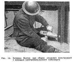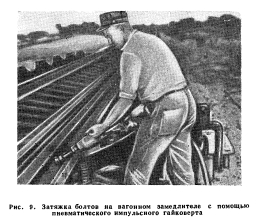 КЛАССИФИКАЦИЯ МЕХАНИЗИРОВАННОГО ИНСТРУМЕНТАПо роду подводимой к двигателю инструмента энергии механизированный инструмент подразделяют на три основных класса: пневматический, электрифицированный и с индивидуальным двигателем. Гидравлика применяется главным образом в тяжелых машинах. О преимуществах каждого класса механизированного инструмента пока идут дискуссии. Пневматический ударный инструмент применяется в течение длительного периода времени; он получил всеобщее признание как один из наиболее удобных. Он особенно удобен на тяжелых работах и обычно применяется для ударного бурения горных пород, разрушения бетонных конструкций, клепальных работ, подбивки балласта под шпалами, окраски поверхностей, торкретирования, цементации земляного полотна под давлением и т. д. Пневматический инструмент с вращательным движением рабочего органа применяется для бурения горных пород, сверления в дереве, развертки отверстий, завинчивания гаек и т. п. Основным достоинством механизмов с индивидуальными двигателями является их независимость от силовых установок. При пользовании этими механизмами исключается необходимость применения резиновых шлангов и электрических кабелей. Особенно значительная экономия получается при работе с этими механизмами в случаях, когда требуется применение одного или двух механизмов. Электрифицированный инструмент отличается компактностью, легкостью в переноске и низкой стоимостью в эксплуатации. Выбор механизированного инструмента для бригад в основном зависит от их состава и характера выполняемых работ. Как правило, крупные бригады работают одновременно с большим количеством механизированного инструмента, требующего мощных силовых установок. Поэтому для таких бригад наиболее подходящим является пневматический и электрифицированный инструмент, получающий энергию от мощных компрессоров и электростанций. Мелкие бригады, наоборот, работают с небольшим количеством одновременно работающих механизмов, которые могут получать энергию от небольших компрессоров или электростанций. Таким бригадам иногда целесообразно применять механизмы с индивидуальными двигателями. При выборе типов механизированного инструмента учитываются условия его применения. Некоторые дороги применяют пневматический инструмент для бетонных и мостовых работ, которые требуют больших силовых установок и электрифицированный инструмент для строительных и водоснабженческих работ, в районе производства которых имеются постоянные источники электроэнергии. ![]() ![]() Существуют различные мнения о том, какие типы механизированного инструмента применять для тех или иных работ. Большинство мнений сходится на том, что для каждой определенной работы следует применять соответствующий инструмент. Импульсные гайковерты представляют собой электрифицированные, пневматические или механические инструменты вращательно-ударного действия, которые оказывают воздействие на гайки при помощи серии быстрых вращательных ударов. Импульсные гайковерты применяются для закручивания гаек при монтаже стальных конструкций, укладке и смене стрелочных переводов, завинчивании шурупов и сболчивании рельсов (рис. 9—11). Небольшие импульсные гайковерты имеют незначительную отдачу на руки, что делает их особенно удобными при работе 