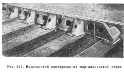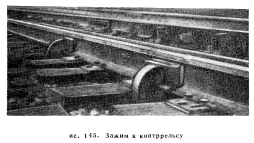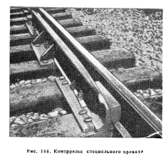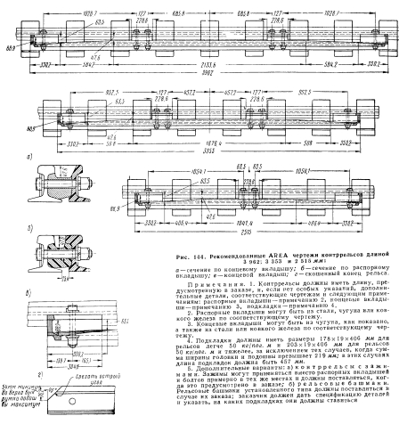 КОНТРРЕЛЬСЫКонтррельс состоит из рельса или ряда рельсов, уложенных параллельно путевым рельсам; его назначение — предотвращать сход колес с рельсов, сохранять правильное направление проходящих по рельсам колес, удерживать на шпалах или брусьях сошедшие с рельсов колеса. Контррельсы разделяются на три типа соответственно их назначению: 1) стрелочные и крестовинные контррельсы, которые ставятся, чтобы предотвратить удар реборд колес в сердечник крестовины в стрелочных переводах и пересечениях или в стрелочные остряки; 2) контррельсы на крутых кривых, которые ставятся для того, чтобы направлять гребни колес локомотивов и вагонов или поддерживать безребордные колеса локомотивов; 3) контррельсы на мостах, которые ставятся для того, чтобы удержать сошедшие с рельсов колеса на шпалах или брусьях на мосту, на виадуке или на эстакаде. Все контррельсы нуждаются в предохранении их от возможного зацепления волочащимися деталями подвижного состава, для чего концы их загибаются или скашиваются под углом около 45°, или срезается металл от шейки и концы загибаются книзу с уклоном на длине 305 мм, или концы прикрепляются к специальному «носу», для чего на мостах может быть использован старый сердечник крестовины. Контррельсы на стрелочных переводах и на кривых отводятся по концам от путевого рельса на ширину не менее 89 мм, чтобы избежать удара гребнями колес; на мостах, где охранные рельсы поставлены у каждого ходового рельса, они отгибаются внутрь к оси пути и соединяются, приближаясь к концу моста. Другой предосторожностью против зацепления контррельсов волочащимися деталями подвижного состава является установка концов их на шпалах. Контррельсы стрелочных переводов. Контррельс стрелочного перевода в простейшей своей форме представляет собой кусок стандартного рельса такой длины, чтобы его можно было отрезать от рельса стандартной длины без отходов. Средняя часть контррельса остается прямой, а оба конца отгибаются или сострагиваются, чтобы получить необходимые отводы, причем подошвы контррельса частично сострагиваются для того, чтобы его головка могла быть поставлена в требуемое положение по отношению к путевому рельсу. AREA разработала стандарты контррельсов длиной 2 515, 3 353 и 3 962 мм (рис. 144), а также рекомендации относительно продольного расположения их по отношению к острию сердечника крестовины. Допускаются небольшие отклонения в зависимости от особых условий. Разработаны и типы конструкций, которым соответствуют различные длины контррельсов, а также чертеж с рекомендуемыми названиями их частей. ![]() Цельнолитой контррельс из марганцовистой стали обычно ставится серединой против острия сердечника или на несколько дюймов впереди в сторону переднего конца крестовины, если это требуется в связи со стандартными расстояниями между брусьями крестовины, которые обычно составляют 495 мм. Контррельс должен быть надежно закреплен для того, чтобы было соблюдено установленное расстояние между рабочими кантами крестовины и контррельса, равное нормально 1 387,5 мм, с допускаемым уменьшением до 1384 мм. Размер 1 387,5 мм основан на практических указаниях о формировании колесных скатов, которые предусматривают стандартное расстояние между рабочей гранью гребня одного колеса и тыльной стороной другого 1383 мм и внутреннее расстояние межд