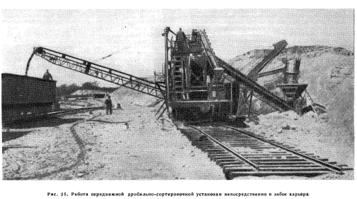 МАШИНЫ ДЛЯ ЗАГОТОВКИ БАЛЛАСТНЫХ МАТЕРИАЛОВОборудование, применяемое для переработки балластных материалов, включает в себя камнедробилки, транспортеры, машины для сортировки и промывки материалов, закрома для хранения и погрузочные бункера. Один из наиболее крупных современных щебеночных заводов рассчитан на добычу в карьере 1 000 т гравия в час и выпуск 650 т дробленого гравия крупностью от 2,5 до 44 мм. На заводе имеются транспортировочные механизмы для подачи добытого в карьере гравия к дробилкам, камнедробилки, грохоты и площадки для готовой продукции; все машины оборудованы ленточными транспортерами и электрифицированы. Камнедробилки представляют собой машины, назначением которых является крупное и мелкое дробление камня или валунов для балласта, бетона и других надобностей. Крупные щебеночные заводы обычно оборудованы как мощными дробилками для крупного дробления с выходом камня размером от 100 до 150 мм, так и более мелкими дробилками для мелкого дробления, полученных после крупного дробления камней до размеров 19—64 мм, как это требуется для щебеночного балласта. Наиболее употребительными типами камнедробилок являются: конусные, щековые, дисковые, валковые и молотковые дробилки, названия которых определяют их принцип действия. Первые два типа дробилок применяют главным образом для крупного дробления, а остальные типы для мелкого, хотя иногда и первые два типа дробилок применяют в обоих случаях. Конусные дробилки. Дробилки этого типа предназначены для крупного и мелкого дробления скальных обломков или валунов с целью использования получаемого щебня по любому назначению. Основными частями дробилки являются; неподвижный, опрокинутый, усеченный конус с ребристой или гладкой внутренней поверхностью, насаженный на вертикальную ось, и вертикальный рабочий вал с подвижным конусом. Камень, загружаемый сверху в неподвижный конус, дробится эксцентрическим вращением подвижного конуса и, проваливаясь через разгрузочную щель между конусами в нижней части дробилки, попадает на наклонный лоток у основания дробилки, установленной на возвышении. Щековые дробилки. Это широко распространенный тип дробилок, применяемых как для крупного, так и для мелкого дробления. Существуют различные типы щеко- вых дробилок, отличающиеся в основном способом подвески и схемой движения подвижной щеки. Как показывает самое название, дробилки этого типа имеют две щеки — неподвижную и подвижную, причем последняя эксцентрически подвешена на горизонтальной оси; обе щеки смонтированы на тяжелой стальной раме и закреплены так, что между ними образуется клиновидное уширяющееся кверху пространство. Через верхнее широкое отверстие производится загрузка дробилки, величину же нижнего отверстия можно отрегулировать для получения щебня любой крупности. Загруженный через верхнее отверстие камень опускается вниз между щеками, где он дробится в результате прямого, а в некоторых типах также и бокового качания подвижной щеки; дробленый щебень высыпается через нижнее отверстие на разгрузочный лоток. ![]() Дисковые дробилки. Дробилки этого типа имеют два вала, из которых один входит в другой. На конце каждого вала насажены круглые диски, изготовленные из твердого металла, имеющие вогнутую форму прилегающих поверхностей. Диски насажены непараллельно о
