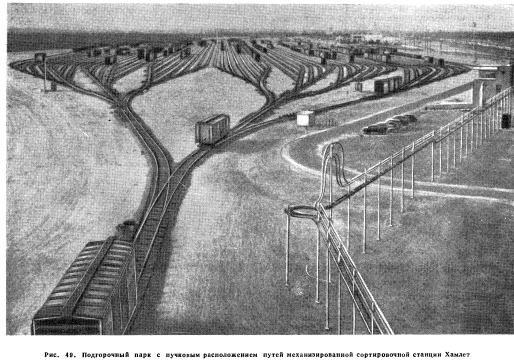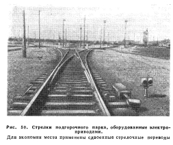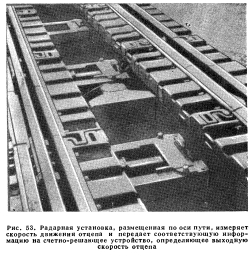 МЕХАНИЗАЦИЯ И АВТОМАТИЗАЦИЯ СОРТИРОВОЧНЫХ ГОРОКВагонные замедлители. Стрелочные приводы. Ограничивающие обстоятельства в работе сортировочных горок. Преимущества механизации. Аппараты управления и посты. Автоматическое управление стрелками. Автоматическое управление замедлителями. Система автоматического управления горочными устройствами фирмы Юнион Ранее, до применения силовых устройств, на сортировочных горках стрелки переводились вручную, а каждый вагон или группа вагонов, или, иначе говоря, отцеп, сопровождались тормозильщиком, который ручным тормозом регулировал скорость движения отцепа на подго- рочный путь. При превышении необходимой скорости тормозилыцик, находящийся на путях, накладывал перед спускающимся отцепом ручной башмак. На современных сортировочных горках стрелки централизуются и управление ими осуществляется из горочных постов; вагонные замедлители регулируют скорость движения отцепов, спускаемых с горки на подгорочные пути; скорость надвига вагонов на горки управляется сигналами. В некоторых установках используются специальные приводы для накладывания на рельсы башмачных замедлителей. На горках оборудуется громкоговорящая телефонная связь для непосредственной связи операторов постов с дежурными по станции и с машинистами локомотивов. На некоторых сортировочных станциях практикуется установка громкоговорителей для связи с работниками, находящимися на путях. На большинстве механизированных сортировочных станций имеются буквопечатающие телеграфные установки для передачи сортировочных листков из технической конторы на горочные посты и распорядителю сортировки. В этих листках дополнительно к номеру пути, куда следует направить каждый вагон, цифрами 1, 2, 3 или 4 указывается категория веса вагона, что используется для выбора правильного режима торможения. На некоторых станциях для передачи сортировочных листков применяется пневматическая почта. Для удобства работы на горках в ночное время зоны размещения стрелок и замедлителей освещаются заливающим светом. Вггонные замедлители. Каждый замедлитель состоит из группы балок с тормозными шинами, расположенными вдоль каждой стороны рельсовой нити. При работе замедлителей тормозные шины нажимают на бандажи колес, замедляя этим движение вагона. Нажатие тормозных шин определяется пневматическими устройствами или тормозными пружинами. Обычно применяются четыре ступени торможения. Давление на обе стороны бандажа колеса должно быть одинаковым, чтобы предотвратить выжимание колеса. Для установки выжатых колесных скатов на место применяются специальные автоматические устройства. Тормозная система вагонного замедлителя соединена рычажным механизмом с электропневматическим или электрическим приводом. У электропневматического привода степень торможения определяется давлением сжатого воздуха в тормозном цилиндре; у электрических приводов степень торможения определяется положением приспособлений, регулирующих силу нажатия пружин на тормозные балки. Пути подгорочного парка объединяются в пучки. В каждый пучок входят 5—7 путей. Перед каждым таким пучком устанавливается замедлитель. Далее на отрезке пути, который соединяет 2—3 пучка, снова устанавливается замедлитель и еще один замедлитель ставится на общем для всех пучко