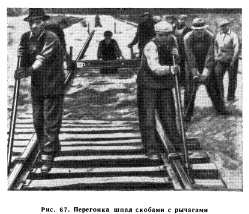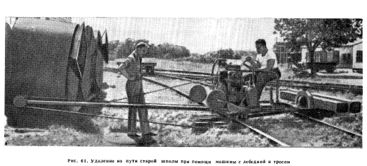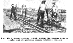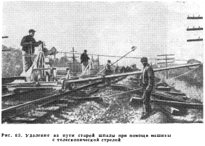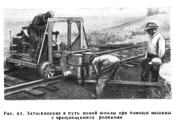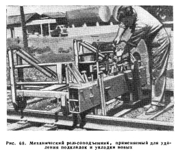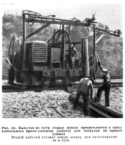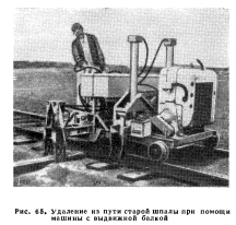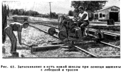 МЕХАНИЗМЫ ДЛЯ СМЕНЫ ШПАЛВ течение многих лет одиночная смена шпал производилась вручную с отрывкой шпальных ящиков и с производительностью смены одна шпала в час. Имелась необходимость в сокращении затраты труда на эту важнейшую работу. В результате приложенных усилий дорогами были сконструированы и испытаны различные механизмы для вытаскивания старых и укладки новых шпал. Одновременно на этих работах нашли применение также и такие механизмы, которые ранее считались нерентабельными. Механизм для разрезки шпал. Одним из первых механизмов, появившихся на железных дорогах и получивший хорошую оценку на некоторых из них, является механизм для рязрезки шпал. Применение этого механизма значительно облегчает извлечение из пути старых шпал, разрезанных на три части; разрезка производится внутри рельсовой колеи около подкладок. Два концевых отрезка шпалы вытаскивают в стороны, а средний поднимают вверх. При смене переводных брусьев делают столько разрезов, сколько это необходимо, чтобы без труда удалить брус по частям. С применением этого механизма вместо отрывки шпального ящика необходимо откопать лишь выходы на откосе против концов шпал. После удаления старой шпалы ограничиваются только необходимой для затаскивания новой шпалы подрезкой постели с минимальным ее нарушением. Механизм смонтирован на раме, установленной над одним рельсом на паре двухребордчатых роликов и опирающейся на противоположный рельс одним простым роликом. Полотно пилы установлено вертикально и изготовлено из узкой стальной полосы с двумя режущими и двумя отгребающими зубьями. Пила приводится в движение небольшим бензиновым двигателем. Механизм для удаления обрезков шпал. Этот механизм был сконструирован специально для совместной работы с механизмом по разрезке шпал. Его назначением является уменьшение объема работ по прокапыванию выходов для шпал и механизация удаления концов шпал после их разрезки шпалорезным механизмом. После извлечения при помощи шпальных клещей средней части распиленной шпалы в образовавшееся пространство опускается гидравлический пресс механизма для удаления концов шпал: после этого приводятся в движение поршни с обоих концов цилиндра пресса, которые и выталкивают оставшиеся концы шпалы наружу. Гидравлический пресс приводится в движение бензиновым двигателем. Машины для вытаскивания и затаскивания шпал. Имеется целый ряд машин отдельно для вытаскивания старых шпал из пути и отдельно для затаскивания в путь новых шпал, а также машин, предназначенных для выполнения обеих операций. Одна из первых машин для удаления старых шпал из пути имеет гидравлическое управление. Машина устанавливается над одним рельсом и опирается на другой при помощи опорной штанги с роликом на конце. Машина снабжена выталкивателем, имеющим два заостренных шипа и вращающимся в вертикальной плоскости при помощи бесконечной цепи. Машину устанавливают над подлежащей удалению шпалой, закрепляют машину цепями за противоположный рельс при помощи крюков, которые заводят за подошву рельса и устанавливают выталкиватель внутри колеи шипами на шпалу. Машинист приводит выталкиватель в движение, вращая его, и одновременно слегка приподнимает противоположный его конец, вследствие чего шипы вонзаются в шпалу, и, вращаясь, толкают ее вперед от