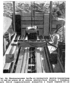 МЕТОДЫ УСТАНОВКИНа эксплуатируемых линиях, особенно при густом движении поездов, установка или смена труб связаны с некоторыми специфическими затруднениями. На участках со слабым движением поездов и значительными окнами между ними, при средней высоте насыпи замену трубы можно произвести, устроив прорези в насыпи под путями. При этом способы поддержания пути зависят от густоты движения, высоты насыпи и характера грунтов, из которых она отсыпана. В случае необходимости вдоль стенок прорези устраиваются свайные опоры, которые одновременно поддерживают доски крепления. Путь укладывается на прогоны или двутавровые балки, покоящиеся на этих опорах, причем прорези можно придать такую ширину, которая желательна по условиям производства работ. ![]() Под высокими насыпями смену труб можно производить тоннельным способом. Иногда при замене прямоугольных труб круглыми оказывается возможным поместить новую трубу внутри старой. В таких случаях обходятся без земляных работ, а новую трубу, уложенную на салазки или катки, устанавливают на место с помощью лебедок или других средств. Применяют также метод продавливания труб сквозь высокие насыпи с помощью домкратов (рис. 36). При этом диаметр трубы должен быть таким, чтобы внутри нее помещался рабочий, разрабатывающий грунт перед концом трубы, который СЛУЖИТ ножом. Трубу продавливают по мере удаления грунта. По окончании работ по установке трубы тоннельным способом или методом продавливания все пустоты необходимо тщательно заполнить и уплотнить с тем, чтобы избежать возможности осадок пути. БАРЫКОВА Н.Г., ГЛУЗМАН И.С. АМЕРИКАНСКАЯ ЖЕЛЕЗНОДОРОЖНАЯ ЭНЦИКЛОПЕДИЯ — М.: ТРАНСЖЕЛДОРИЗДАТ, 1959. |