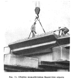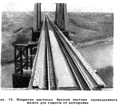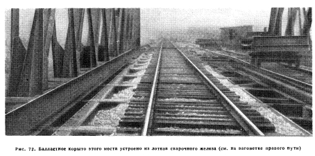 МОСТОВОЕ ПОЛОТНО ПРИ ЕЗДЕ НА БАЛЛАСТЕПуть на балласте (рис. 69) создает лучшие условия для движения поездов. При этом путь на мосту и на насыпи обладает одинаковой жесткостью, благодаря чему отсутствуют толчки при входе на мост. Содержание пути на мосту является обязанностью путевых рабочих, которые бывают на мосту гораздо чаще, чем персонал, обслуживающий искусственные сооружения. Важно также и то, что ответственность за содержание пути у конца моста не разделяется между мостовиками и путейцами. Однако необходимо следить за тем, чтобы в процессе ремонта пути сохранялся профиль пути на мосту и на подходах к нему с тем, чтобы на пролетном строении не накапливалось излишнее количество балласта. При езде на балласте требуется принимать специальные меры по защите металлических частей пролетного строения от коррозии, а также против повреждений в случае схода поезда с рельсов. Род балласта. Надежная работа балластного корыта железнодорожных мостов в значительной степени зависит от рода балласта и его толщины. Можно считать достаточной толщину балласта под подошвой шпалы 15—20 см; толщина более 30 см нежелательна вследствие увеличения постоянной нагрузки, за исключением тех случаев, когда эта перегрузка учтена проектом. Хороший балласт для мостов состоит из мелкого щебня или гравия однородных размеров, достаточно твердого и неразмельчающегося, плотного и не впитывающего влагу, обладающего формой, которая способствует легкой укладке. Такой балласт обеспечивает: 1) прочное основание для шпал, чем создается равномерное распределение нагрузки; 2) упругое основание для пути, что улучшает ездовые качества последнего; 3) быстрый отвод всей воды с мостового полотна, что содействует содержанию балласта чистым и сухим; 4) надежное закрепление пути в профиле и плане. Мостовое полотно. При езде на балласте конструкция мостового полотна не отличается от верхнего строения пути на земляном полотне. Проезжая часть мостов с ездой на балласте неизбежно должна отличаться по конструкции от мостов с ездой на поперечинах. Типы проезжей части. В настоящее время применяют следующие типы проезжей части для мостов с ездой на балласте: 1) перпендикулярно оси пути по стальным или металлическим балкам укладывают толстые доски, пропитанные креозотом; 2) перпендикулярно оси пути по главным балкам или продольным балкам укладывают железобетонные плиты; 3) балластное корыто устраивают из стальных листов, уложенных по главным балкам малых пролетных строений или по поперечным прокатным ба- лочкам, прикрепленным к продольным элементам — в пролетах большей длины; 4) стальные корыта располагают вдоль оси моста для малых пролетов и поперек оси для более длинных пролетов и заполняют в нижней части бетоном; 5) металлические плиты укладывают на ряд поперечных балочек таврового сечения переменной высоты со скошенными стенками, что обеспечивает сток воды вдоль и поперек оси моста; эти балочки опираются посредством широкополочных балок или планок на поперечные балки, лежащие на главных балках. Помимо описанных, наиболее употребительных, систем применяют и некоторые другие конструкции. Широкое распространение получили балластные корыта из пропитанной древесины (рис. 70), обладающие рядом преимуществ по сравнению с другими типами. Стоимость сооружения деревянного