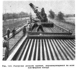 ОРГАНИЗАЦИЯ РАБОТ ПО УКЛАДКЕ РЕЛЬСОВВ организации работ по укладке рельсов, особенно на больших железных дорогах, наблюдается тенденция к созданию окружных или специализированных бригад, обученных операции укладки рельсов и имеющих постоянный план работ. Эти бригады заменяют собой участковые или еще более мелкие бригады, ранее создаваемые путем объединения отделенческих и дополнительных бригад и работавшие только в радиусе действия объединяемых бригад. Большие специализированные бригады по смене рельсов организуются в составе от 75 до 140 чел. в зависимости от объемов работ, имеющегося в наличии оборудования и желательных сроков выполнения смены рельсов. Количество рабочих в бригаде назначается также с учетом того, чтобы перерывы в движении поездов были как можно меньшие. На большинстве цорог эти большие бригады перемещаются в полном составе с одного участка на другой; рабочие живут или в вагонах или в передвижных домиках, которые в процессе работы перебрасываются с места на место. На некоторых дорогах рельсы все еще меняются допол нительными бригадами, комплектуемыми до полного состава за счет рабочих отделенческих бригад. Но даже в этих случаях обычно стремятся по возможности сохранять неизмененным ядро бригады для того, чтобы использовать опыт, накапливаемый рабочими в процессе работ. На некоторых дорогах для смены рельсов все еще практикуют объединение отделенческих бригад, особенно если срок работ ограничен или если участки пути, на которых происходит смена рельсов, сравнительно коротки и находятся в разных местах. Однако целесообразность применения более крупных бригад получает все большее признание. Использование оборудования. Большие специализированные бригады по смене рельсов требуют применения в широких масштабах механизмов для обеспечения максимальной производительности работ в сочетании с должным качеством их выполнения. Для наиболее эффективного использования механизмов при смене рельсов требуется наличие специалистов как по использованию механизмов, так и по организации всех работ по смене рельсов. Максимальную производительность при таких сложных работах, как смена рельсов, невозможно обеспечить без механизмов, независимо от количества занятых в этой операции рабочих, максимального использования оборудования при наличии квалифицированных рабочих, а также без тщательно организованной подсобной рабочей силы. В том случае, если бригады достаточно насыщены механизмами, многое зависит от продуктивности работы каждого отдельного механизма. Поэтому желательно, чтобы в состав бригады входило не менее одного опытного механика или специалиста по ремонту механического оборудования и заранее были приняты меры по обеспечению бригады необходимыми запасными частями. Кроме того, бригада должна быть оснащена и ручными инструментами, чтобы в случае поломки механизмов имелась возможность временно выполнять отдельные виды работы ручными способами. Запасные ручные инструменты, так же как и запасные механические гаечные ключи, костыледеры, машины для затески шпал, костыльные молотки, позволяют бригаде продолжать работу почти без перерыва во время ремонта механизмов. Перерывы в движении поездов для производства работ. Если необходимо достичь максимального использования бригады по смене 