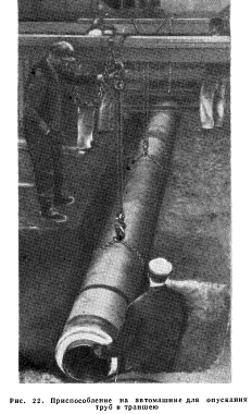 РЕКОМЕНДАЦИИ AREAХотя инструкции AREA относятся главным образом к укладке чугунных труб, однако многие из основных требований их пригодны и для всех типов труб. Ниже приведены сокращенные инструкции. Расположение трубопровода Расположение трубопровода должноустанавливаться инжене - ром и согласовываться с заказчиком. Землеройные работы Дно канавы должно быть ровное и иметь необходимый уклон а также достаточную ширину, чтобы обеспечить укладку труб и выполнить их соединение. Затем канаву закапывают и утрамбовывают. Там, где это необходимо, в канавах устанавливают подпорки для защиты рабочих от возможного обрушивания стен. Если после работы канаву не зарывают, то необходимо закрывать ее и ограждать в ночное время фонарями. За работами днем и ночью должен наблюдать техник. Техник устанавливает также длину канавы. Запрещается рыть новые канавы, если не засыпаны старые или работы угрожают безопасности рабочих. Подрядчик обязан производить все насосные, дренажные и другие работы, необходимые для обеспечения чистоты канавы перед укладкой труб. Все водопроводы, газопроводы или какие-либо другие линии подземного трубопровода должны быть укреплены так, чтобы обеспечить их сохранность. Если под влиянием сырости дно канавы размягчится, то необходимо выкопать слой размягченной породы и заменить его каким-либо другим материалом по указанию техника. Подрядчик должен выполнять все землеройные работы так, чтобы не повредить железнодорожные пути или не нарушить работу дорог. Он должен ограждать место работы, чтобы обеспечить безопасность персонала железных дорог и гражданских лиц. Укладка труб Трубы укладывают так, чтобы были обеспечены нужный уклон и кривизна по всей их длине. Трубы необходимо опускать на место, поддерживая их за раструбы. Прежде чем соединять трубы, их следует тщательно очистить от грязи изнутри. Раструбы должны быть достаточной глубины и ширины, чтобы обеспечить хорошее соединение. Во время сборки соединений раструбы должны быть сухими. Для предохранения труб от повреждений при укладке применяются специально оборудованные автомашины, имеющие поддерживающие приспособления (рис. 22). Клапаны, гидранты и другие приспособления должны устанавливаться по указанию техника. Перед окончанием работы все от-крытые концы труб должны быть закрыты. Специальные трубы, соединения и приспособления (Инструкции, предназначенные для заводов-поставщиков, можно использовать как руководства для отдельных компаний, которые хотят применить специальные трубы, соединения и приспособления. ) Испытания После окончания работ вся линия трубопровода должна быть испытана гидравлическим давлением в присутствии техника. Испытания можно проводить также на отдельных участках трубопровода длиной до 300 м (если возможно между клапанами) перед засыпкой канавы. Утечка не должна превышать одного галлона (3,78 л) в день на 1 дюйм (25,4 мм) диаметра трубы длиной в 1 милю (1,609 км). Испытания должны проводиться до засыпки канавы. Следует ликвидировать все выявленные неисправности в стыках при обнаружении утечки, а также заменить все лопнувшие трубы и арматуру новыми, затем необходимо провести повторное испытание трубопровода. Операции по выявлению недостатков и испытания надо проводить до тех пор, пока трубопровод не будет смонтирован удовлетворите