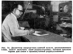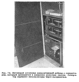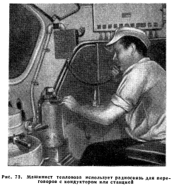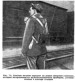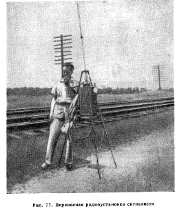 ПОЕЗДНАЯ РАДИОСВЯЗЬСвязь поезда со станциями. Применение постоянной радиосвязи. Правителъственные положения по поездной радиосвязи. Развитие радиосвязи. Станционная радиосвязь. Энергоснабжение устройств радиосвязи. Радио для путевых работ Поездная радиосвязь, осуществляемая только по радио или по радиопроводной системе, является средством связи между поездами или между поездами и станциями. Поездная радиосвязь используется для связи: между локомотивом и кондукторской кабиной, между локомотивами и кондукторскими кабинами разных поездов, а также между поездом и диспетчером. При остановке поезда радиосвязь используется для связи между локомотивом или кондукторской кабиной и сигналистом, имеющим при себе переносную портативную радиостанцию. При индуктивной или радиопроводной системе для передачи используется пучок проводов столбовой линии связи. Связь поезда со станциями. Дальность действия радиоаппаратуры, устанавливаемой на локомотивах, составляет 8—16 км для связи между поездами и 24—32 км для связи с радиостанциями промежуточных пунктов. Такие радиостанции располагаются через 32—40 км на участках протяжением 240—320 км и более. Радиостанций промежуточных пунктов управляются операторами круглосуточно или только в продолжение части суток. Операторы имеют возможность подключать промежуточные радиостанции к диспетчеру по его цепи с использованием для такой связи обычной телефонной аппаратуры. Имеются также устройства, где диспетчер, используя систему удаленного управления, включается в промежуточную радиостанцию и вызывает машиниста или кондуктора поезда, находящегося в пределах досягаемости данной промежуточной радиостанции (рис. 72). Аналогичным путем диспетчер может быть вызван поездом. При расположении промежуточных радиостанций через 32—40 км и при обрыве проводов между двумя промежуточными пунктами связь диспетчера с поездами сохраняется при включении в действие также и двух радиостанций, находящихся по концам поврежденного участка. ![]() Применение поездной радиосвязи. Поездная радиосвязь используется весьма многоообразно и широко, и это дает основание суждениям о предпочтительности и незаменимости этого вида связи. Радиосвязь в пределах поездного состава особенно важна для длинных товарных поездов, где затруднен обмен сигналами между работниками поездной бригады. Внутрипоездная радиосвязь используется, например, для следующего: 1. Для вызова машинистом кондукторов при проверке тормозов до отправления поезда и получения от них сведений о результатах проверки. 2. Для передачи кондуктором сообщений машинисту о наличии посторонних людей в составе. 3. Кондуктор может обратиться к машинисту, если это желательно или необходимо, с предложениями об увеличении или снижении скорости. 4. Поездной персонал, находящийся в разных концах поезда, может производить сравнения поездных приказов полученных в процессе движения поезда. 5. Поездной бригаде могут быть заранее переданы ука зания о предстоящей работе на станции. 6. Кондуктор может указать машинисту на необхо димость продвинуть состав, чтобы освободить переезд стрелки и т. п. 7. Кондуктор в процессе движения поезда может пере дать машинисту сообщения о волочащихся деталях, го рящих буксах и о других неисправностях, требующих остановки поезда, и може