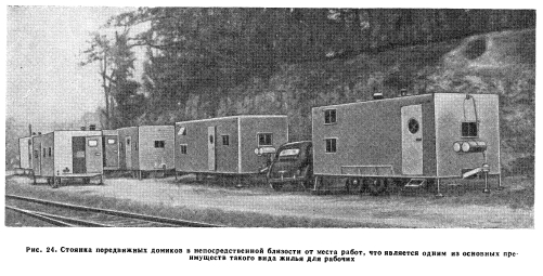 ПРЕИМУЩЕСТВА ЖИЛЫХ ДОМИКОВ, НЕ СВЯЗАННЫХ С ЖЕЛЕЗНОДОРОЖНОЙ КОЛЕЕЙДомики на автомобильных прицепах могут быть в случае необходимости без всякой задержки переброшены с одного места на другое. При этом бригады не теряют времени на ожидание прибытия своих домиков на новое место, потому что рабочие обычно перебрасываются на место работ автомобилями одновременно с перевозкой домиков. На одной дороге, которая для жилья рабочих применяет в основном домики на автомобильных прицепах, все грузовые автомобили оборудованы специальными сцепными крюками для их прицепки. Обычно передвижные бригады берут с собой необходимые для производства работ материалы, инструменты и оборудование, которое им потребуется на новом месте работ. Небольшие бригады, которые доставляются на место работ автомобилями, тоже принуждены брать с собой необходимые материалы, инструменты и оборудование. Эти автомобили также используются для переброски передвижных домиков. Для перевозки большого количества материалов и оборудования, которое нельзя перевозить бригадам вместе с собой на автомобилях, используются специальные передвижные домики, предназначенные для хранения материалов и оборудования. Таким способом перевозятся, например, бульдозеры и другие типы тяжелых землеройных машин. Иногда бригады с передвижными домиками целесообразно перебрасывать на новое место работ с запасом материалов и оборудования на несколько дней, а специальные передвижные домики с материалами и оборудованием отправлять железнодорожным транспортом. ![]() Особенно большим преимуществом передвижных домиков на автомобильных прицепах, по мнению железнодорожников, является возможность их стоянки в непосредственной близости от места работ (рис. 24). В таких случаях бригады затрачивают меньше времени на проход до места работ и обратно и поэтому могут уделять больше времени работам. В тех случаях, когда места стоянок домиков на автомобильных прицепах расположены далеко от источников воды и электроснабжения, но в непосредственной близости от места работ, вода должна подвозиться в автоцистернах, а для освещения использоваться передвижные электростанции. БАРЫКОВА Н.Г., ГЛУЗМАН И.С. АМЕРИКАНСКАЯ ЖЕЛЕЗНОДОРОЖНАЯ ЭНЦИКЛОПЕДИЯ — М.: ТРАНСЖЕЛДОРИЗДАТ, 1959. |