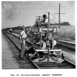 ПРИБОРЫ И МАШИНЫ ДЛЯ ВЫПРАВКИ ПУТИ В ПЛАНЕВыправка пути в плане была всегда одной из наиболее трудных, дорогих и трудоемких работ при текущем содержании пути. Особенно трудными БТИ работы стали в последние годы в связи с применением тяжелого верхнего строения. Действительно, сейчас нередкость видеть, как при нормальной балластной призме 20 путевых рабочих и больше с рихтовочными ломами выправляют путь в плане. В большинстве случаев работы по выправке пути в плане в США производятся вручную с помощью рихто- вочных ломов, путевых д мкратов, а также и легких моторных путевых рихтовщиков на рельсовом ходу. Пере- численные приборы рассмотрены в главе XXI «Путевой инструмент и оборудование». В связи с необходимостью увеличения производительности труда путевых бригад, нанятых нч работах по выправке пути в профиле, а также необходимостью улучшения качества работ по постанови пути в плане было выпущено много машин, управляемых небольшим числом работников (2 чел.) Эти машины выполняют с более высоким качеством производившиеся ранее вручную работы по рихтовке пути. Они выправляют путь в плане на протяжении 1,6 км в смену и больше. Основным преимуществом этих машин является их постоянная производительность, что не имеет места при производстве работ вручную в связи с усталостью рабочих к концу рабочего дня, особенно при высоких температурах воздуха. Машины для выправки пути в плане. Для выправки пути в плане применяется машина на рельсовом ходу, управляемая механиком и его помощником. Машина после укрепления захватами за оба рельса укладывает два опорных башмака в шпальные ящики и нажимает на них штоками с помощью гидравлических насосов; путь и сама машина при этом несколько приподнимаются После этого давлением двух горизонтальных штоков на опорные башмаки путь перемещается в требуемое положение. Машина опирается на отдельные, не соединенные между собой осями колеса; это позволяет отводить в сторону два колеса с того рельса, по которому ведется рихтовка и этим обеспечить необходимую видимость рихтуемой рельсовой нити. Другая машина для выправки пути в плане на рельсовом ходу имеет примерно такое же устройство, но на ней, кроме того, установлен оптический прибор для определения размера сдвижек пути по методу натянутых нитей. Все рабочие органы машины работают с помощью гидравлики. Машина управляется механиком и его помощником. ![]() На рис. 48 показана путерихтовочная машина Нордберг. Для выправки пути в плане на дорогах применяется машина на гусеничном ходу, расположенном между рельсами. Машина управляется одним механиком. Выправка пути в плане производится посредством рихтоЕочной головки, расположенной в передней части машины. Рих- товочная головка состоит из горизонтально действующего гидравлического штока,который сдвигает путевую решетку, нажимая на подошву одного из рельсов. Упором для штока является завинчивающийся в шпальном ящике с помощью гидравлики винтовой анкер. Для освобождения пути машина приподнимается на гидравлических домкратах, поворачивается на 90° и сходит с пути. На дорогах также применяется небольшое приспособление на двухребордчатых роликах для выправки пути в плане, состоящее из двух гидравлических домкратов и передвижной силовой установки с масляным насосом. Домкраты упираются в балласт в шпальн