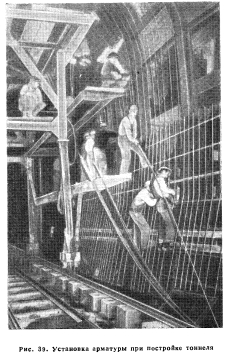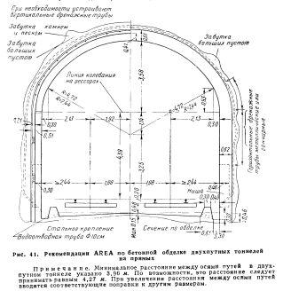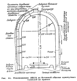 ПРОЕКТИРОВАНИЕ1. Внутренние размеры. Внутренние размеры тоннеля должны быть назначены в полном соответствии с габаритами для тоннелей, рекомендованными AREA1. Если официальные требования предусматривают необходимость большего габарита тоннеля, то они должны быть выполнены. На закруглениях габарит должен быть увеличен с тем, чтобы допустить пропуск вагона длиной 25,9 м, высотой 4.25 м с расстоянием между шкворнями тележек 8.2 м. Еозвышение наружного рельса должно соответствовать рекомендациям AREA. В тоннелях, проходящих через водоносные слои, для возможности размещения водоотводов расстояние от оси до стенки должно быть не меньше 2,74 м, а в тех случаях, когда требуется устройство вентиляции, высоту тоннеля следует увеличить не меньше чем на 30 см. 2. Сбор предварительных данных. Для получения сведений, необходимых при проектировании нового тоннеля, проводят полевые изыскания, определяют геологический разрез, выясняют гидрологические условия (грунтовые воды), устанавливают места сбросов, проводят колонковое бурение, определяют прочность скалы, подлежащей разработке, а также собирают данные о существующих тоннелях, проходящих в аналогичных условиях. В тех случаях, когда новый тоннель прокладывается вблизи от существующего, необходимо исследовать старые архивные документы для получения данных о грунтовых водах, зонах сбросов и др. Если архивные материалы недостаточны, следует провести колонковое бурение в существующих соседних тоннелях. 3. Путь и балластные стенки. Путь может укладываться на балласте, находящемся между специальными стенками, либо представлять собой монолитную плиту с забетонированными шпалами. Рельс должен через двухребордчатые подкладки опираться на забетонированные полу шпалы сечением 20 х 25 см длиной 0,76 м, расположенные на расстоянии 0,5 м между осями и прикрепляться костылями или шурупами. На кривых возвышение наружного рельса осуществляют увеличением толщины соответствующих полушпал. 4. Стены и свод. В твердой и прочной скале глубина заложения боковых стен должна быть не менее 15 см ниже дна балластного корыта или ниже поверхности путевого бетона при бетонированных шпалах. В слабой скале боковые стены должны быть доведены до устойчивого основания. У порталов подошва стен должна находиться не менее чем на 15 см ниже линии промерзания. Наименьшая толщина стен при проходке без временного крепления должна быть: для однопутных тоннелей — 38 см: для двухпутных тоннелей — 53 см. Если временное крепление стен выработки необходимо, то внутренняя поверхность бетона при деревянных стойках рам, расположенных на взаимном расстоянии не менее 30 см, должна отстоять: для однопутных тоннелей—на 36 см от внутренней поверхности стойки; на 66 см от внутренней поверхности забирки; для двухпутных тоннелей—на 46 см от внутренней поверхности стойки; на 76 см от внутренней поверхности забирки. ![]() ![]() ![]() Рыхлую и слабую скалу из-под стен и лотка надо удалять до начала бетонирования. Если по характеру скалы это нецелесообразно, то лоток и фундаменты стен следует армировать. Водоотвод во время бетонирования. Бетон нельзя укладывать в проточную воду. Необходимо принимать специальные меры для осушения каждого участка, куда укладывается бетон. Для предотвращения гидростатического давления на обделку устраивается система дренажа. У