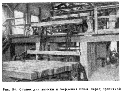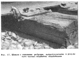 ПРОПИТКА ШПАЛВопросы консервирования древесины пропиткой более подробно изложены в главе VIII раздела первого «Консервирование древесины», поэтому ниже проводятся лишь некоторые соображения, специально касающиеся шпал. Механическая обработка шпал. Значительное число шпал до пропитки подвергается механической обработке, которая заключается в затеске и предварительном сверлении костыльных отверстий (рис. 56). Такая обработка имеет ряд преимуществ. Основным является то, что в этом случае не ослабляется действие антисептика, наоборот, оно увеличивается за счет более глубокой пропитки шпал в подрельсовом сечении, где она наиболее необходима. Машинная затеска обеспечивает более ровную постель под подкладкой, чем ручная. При забивке в предварительно просверленные отверстия костыли не повреждают волокон древесины и лучше держат рельсы, таким образом путь легче содержать по шаблону. Применение наколки перед пропиткой твердых пород древесины увеличивает глубину проникания и объем поглощаемого антисептика, улучшая тем самым качество пропитки. При механической обработке шпал перед пропиткой обычно их клеймят на торцах с условным обозначением: древесной породы, способа пропитки, типа рельса, для которого просверлены отверстия, года пропитки, типа шпалы, марки завода и названия железной дороги, которой принадлежат шпалы. Комитетом AREA по шпалам в 1953 г. были разработаны указания по обработке шпал от момента рубки леса до укладки готовой шпалы в путь. В части, касающейся пропитки, эти указания приведены в главе VIII первого раздела «Консервирование древесины», в части хранения шпал после пропитки они вкратце даются ниже. Пропитка. Для предохранения от гниения все шпалы должны быть пропитаны. Для назначения более дешевого способа пропитки необходимо предварительно установить: породу леса, из которого изготовлены шпалы; наиболее подходящие для нее антисептики; состояние водоотводов грунтов и состояние земляного полотна; род и состояние балласта; размеры грузооборота и действующие скорости движения поездов; осевые нагрузки и тип обращающегося на дороге подвижного состава; климатические условия. ![]() Хранение шпал после пропитки. Очень важно осторожное обращение со свежепропитанными шпалами. Хранение их должно быть организовано так, чтобы полностью избежать повреждения пропитанного слоя древесины с тем, чтобы не допустить возможности проникания гнилостных грибков в непропитанную древесину, расположенную под пропитанным слоем. Необходимо иметь в виду, что для шпал, на поверхности которых обнажается слабо проницаемая для антисептика ядровая древесина, глубина пропитки составляет всего 2,5 см. При пропитке шпал из твердых пород леса экономически нецелесообразно добиваться проникания антисептика на сколько-нибудь значительную глубину в ядровую древесину, поэтому весьма важно избегать всяких повреждений пропитанного слоя. Повреждение шпалы острым орудием, например киркой или лопатой, может служить причиной проникания грибка и заражения шпалы гнилью. Удары костыльным молотком или другим орудием (рис. 57), вызывая разрыв волокон древесины, могут привести к образованию местных скоплений влаги, создавая тем самым на этих участках условия для возникновения гниения. Статистика пропитки. В течение ряда лет для пропитки шпал пр