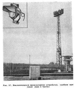ПРОЖЕКТОРНОЕ ОСВЕЩЕНИЕ СТАНЦИЙОсвещение наружных железнодорожных объектов например сортировочных станций, обеспечивает наиболее безопасную и производительную работу, которая только возможна в ночное время. В настоящее время обычно применяют стальные вышки высотой 24—36 м, которые поддерживают группы прожекторов с подходящим направлением лучей, использующих лампы мощностью 750—1500 в. Это освещение также обеспечивает лучшую охрану. Три общие системы освещения станций могут быть классифицированы в общем как прожекторное освещение с заливающим светом в одно направление, параллельновстречное прожекторное освещение с заливающим светом и освещение с рассеянным светом. При прожекторном освещении в одно направление лучи прожекторов направлены все в одну сторону — в направлении вагонопотоков. Эта система имеет то преимущество, что работники не ослепляются светом прожекторов. Расстояние между вышками не должно превышать, а лучше быть немного меньше эффективного радиуса действия прожекторов. Как правило, вышки могут быть расположены на расстоянии 450— 600 м одна от другой. Прожекторное освещение в одно направление имеет тот недостаток, что видимость объектов обеспечивается только отраженным светом, а большинство подвижного состава и оборудования на железнодорожных станциях имеет низкую отражательную способность. При параллельно-встречном прожекторном освещении свет направляется в оба направления. Преимуществом этой системы является то обстоятельство, что вышки могут быть расположены в два раза дальше одна от другой, чем при прожекторном освещении в одно направление, и могут, при необходимости, иметь прожекторы, направленные в оба направления. Недостатком этой системы является ослепляющее действие на работников. По этой причине местоположение вышек должно быть тщательно выбрано и вышки должны иметь возможно большую высоту, которая практична с экономичной точки зрения, чтобы прожекторы были возможно выше над прямой линией зрения. Однако параллельно-встречная система имеет то преимущество, что объекты становятся видимыми в результате действия света двумя способами: 1) в результате отражения света от объектов. Этот свет может исходить из прожекторов, расположенных сзади или сбоку работника, или же может быть результатом зеркального или рассеянного отражения от головок рельсов, боковых стенок вагонов или других предметов; 2) в результате выделения контуров предметов против света прожекторов, расположенных вдали. Освещение механизированных горок. В общем системы прожекторного освещения в одно направление имеют наибольшее распространение на механизированных горках, где операторы должны иметь возможность видеть пути подгорочного парка с постов управления для того, чтобы определить степень торможения вагонов. Если отчасти применяется встречное освещение, прожекторы должны быть расположены и направлены таким образом, чтобы их прямое ослепляющее действие в направлении постов управления горки было доведено до минимума. Освещение горловины подгорочного парка должно быть сравнительно ярким, чтобы операторы могли сравнить свои сортировочные листы с фактическим проходом вагонов по замедлителям. Параллельно-встречная система освещения обычно применяется на немеханизированных горках, где используются тормоз