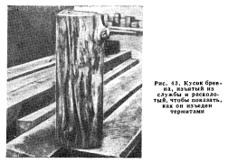 РЕКОМЕНДАЦИЯ АRЕАСледующие общие положения, касающиеся консервирования древесины, одобрены AREA в 1954 г. Все лесные материалы, подверженные гниению или повреждению организмами, разрушающими древесину, если они не имеют естественной защиты против разрушительного действия этих организмов, подлежат консервирующей обработке, что дает экономию в ежегодных затратах на содержании обработанного таким образом леса. Наибольшая экономия получается при тщательном выборе антисептиков, правильном назначении способа пропитки и при условии предохранения пропитанных изделий от повреждений. Для обеспечения хорошего качества пропитки необходим компетентный инспекторский иадзор за работами. Ядровая древесина большинства твердых лесных пород не принимает пропитывающих составов, тем не менее срок их службы заметно увеличивается после обработки химикатами, хотя глубина их проникания в дерево невелика. Консервирующая обработка не может восстановить прочность древесины, утраченную вследствие наличия у дерева пороков любого вида: отсюда следует, что только древесина, свободная от таких пороков, которые могли бы сделать ее непригодной к употреблению, может с успехом подвергаться пропитке. До пропитки древесина требует специальной предварительной подготовки, в результате которой она приобретает способность принимать антисептики без снижения своей прочности. Там, где это возможно, древесина подвергается воздушной сушке. Если времени для воздушной сушки недостаточно или когда пропитке подлежат крупные изделия, длительная воздушная сушка которых в некоторых районах невозможна без сильного растрескивания древесины, применяется искусственная сушка. Прогрев паром применяется для тех пород леса, которые ие подвергаются интенсивному растрескиванию или короблению под действием высоких температур. Пропаривание применяется при обработке дугласовой сосны как с побережья, так и из горных долин, западного хемлока и лиственницы только при пропитке их растворами солей. Причины гниения. Гниение является главным разрушителем непропитанной древесины. Гниение вызывается грибами, представляющими собой низшую форму растительного мира. Грибы большей частью состоят из тонких нитевидных гифов, пронизывающих дерево во всех направлениях. Клетки древесины составляют пищу грибов; когда грибные гифы проникают в дерево и с помощью выделяемых ферментов растворяют древесину, она разрушается — гниет. Для роста грибов необходимы четыре основных условия: воздух, влага, благоприятная температура и питание, которое гриб получает из древесины. Если гриб лишается одного из этих условий, то гниения не происходит. Гниение, которое происходит в древесине, не достаточно влажной для развития гнилостных организмов внутри нее, часто носит название сухой гнили. Грибки в этом случае развиваются в сырых подвалах или на дереве, соприкасающемся с грунтом. Эти грибки распространяются подлине дерева на расстояние до 6 м и более. Необходимая для развития грибков влага берется последними из влажного окружающего воздуха и проникает в древесину через мельчайшие поры при помощи нитевидных гифов гриба, которые распространяются по поверхности дерева. Термиты. Кроме гниения, наиболее серьезные разрушения непропитанной древесине приносят термиты и морские древоточцы. Т