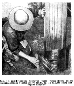 РЕКОМЕНДАЦИИ AREAАнтисептики. Следующие технические условия для наиболее распространенных антисептиков были пересоставлены AREA в 1953 г. Креозот 1. Креозот представляет собой продукт перегоики каменноугольной смолы, получаемой при карбонизации битуминозных углей. 2. Креозот не должен содержать более 3 % воды. 3. При растворении в бензоле нерастворимый осадок не должен превышать 0,5 % (см. примечание 1). 4. Удельный вес креозота при 38° С по отношению к весу воды при 15,5° С должен быть не менее 1,03. 5. Перегонка, считая креозот свободным от воды, должна проходить в следующих пределах (см. примечание 1): до 210° С не более 5 %; 235° С 25 % и не менее 5 %; 270° С не менее 20 %; 355° С не более 85 % и не менее 60 %; 6. Удельный вес фракции, полученной при температуре между 235 и 315° С и определяемый при 38° С по отношению к весу воды при 15,5° С, должен быть не менее 1,025, а фракции, полученной при температуре между 315 и 355° С, не менее 1,08 5 7. Креозот не должен давать более 2 % коксового осадка.. 8. Выше приведенное испытание должно производиться в соответствии со стандартными методами AWPA, стандарт А-1. Примечание. Для проб, взятых из креозота, бывшего в употреблении, допускается некоторое увеличение веса не растворимого в бензоле осадка, так же как и коксового осадка, и уменьшение процентного содержания различных фракций, происшедшее в процессе пропитки. Если же количество осадка, не растворимого в бензоле, или кокса не превышает пределов, установленных техническими условиями, более чем на 1 %, а процентное содержание различных фракций дистиллята ие ниже чем на 3 % минимального предела, установленного техническими условиями, и одновременно можно доказать, что исходный креозот отвечал установленным техническим условиям, то креозот, бывший в употреблении, можно также рассматривать, как отвечающий требованиям технических условий. Смесь креозота с каменноугольной смолой Антисептик должен являться продуктом чистой каменноугольной смолы, получаемой при карбонизации битуминозного угля. Он может быть или дистиллятом каменноугольной смолы, или раствором этой смолы в дистилляте масла. Антисептик должен удовлетворять следующим требованиям: ![]() 7. Удельный вес фракции, полученной при температуре перегонки между 235° и 315° С при 38° С по отношению к весу воды при 15,5° С должен быть не менее 1,035, а фракции, полученной при температуре между 315 и 355 С, — не менее 1,085. 8. Вышеприведенное испытание должно производиться в соответствии со стандартными методами AWPA, стандарт А-1. Примечание. Для проб, взятых из креозота, бывшего в употреблении, допускается некоторое увеличение веса не растворимого в бензоле осадка, так же как и коксового осадка. Это увеличение, при условии непревышения нормы, установленной техническими условиями, не может служить причиной браковки антисептика, если можно доказать, что исходный свежий антисептик отвечал требованиям технических условий. Смесь креозота с керосином Смесь креозота с керосином должна составляться путем смешивания в определенных пропорциях креозота, полученного из каменноугольной смолы по техническим условиям AREA иа креозот, и керосина, отвечающего техническим условиям AREA на керосин для смешивания с креозотом. Никакая смесь креозота с керосином не должна содержать креозота менее 50 % по объему. Керосин для смешивания с креозотом Керосин, употребляемый для смеши