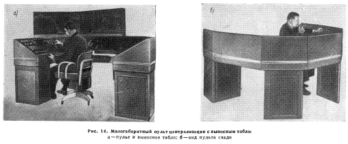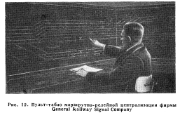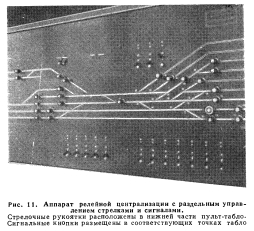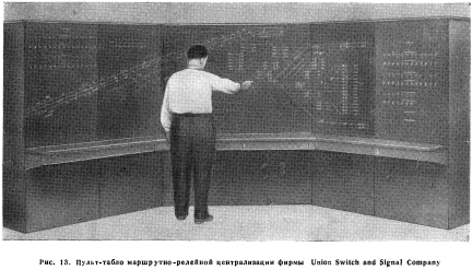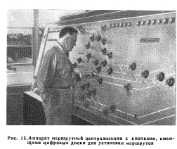 РЕЛЕЙНЫЕ ЦЕНТРАЛИЗАЦИИПервая централизация с исключительно электрическими, или, иначе говоря, с релейными зависимостями была установлена в 1929 г. на железной дороге Рок Айленд. В последующем релейные зависимости в централизациях получили исключительно большое применение; в новых централизациях, построенных после 1945 г., только изредка встречаются механические замыкания. Электрические замыкания. Механические замыкания выполняют три основные функции: не допускают установку враждебных маршрутов, препятствуют повороту рукояток для открытия сигналов враждебных маршрутов и контролируют правильное положение рукояток всех стрелок данного маршрута. В релейных централизациях равнозначные замыкания осуществляются размыканием цепей управления контактами других рукояток или контактами реле, связанных с этими рукоятками. Для открытия сигналов определенные стрелки, а также сигналы, их рукоятки и повторители должны находиться в соответствующем положении. Другими словами, сигналы замыкают стрелки и враждебные сигналы точно таким же образом, как и при механической централизации. Каждая стрелка обычно управляется реле, которое в свою очередь включается рукояткой. В цепь этого реле входят контакты реле, контролирующих незанятость стрелочных и путевых участков. При использовании маршрутного замыкания контакты маршрутно-замы- кающего реле включаются непосредственно в цепь стрелочного управляющего реле. Такое устройство сделало излишним применение электрических защелок на стрелочных рукоятках, используемых для контроля незанятости стрелочных участков. Положение каждой стрелки проверяется стрелочно-контрольными реле, контактами которых включаются повторительные лампы у стрелочных рукояток. На стрелочных рукоятках отсутствуют электрические защелки для проверки соответствия между положением стрелки и положением рукоятки, но эквивалентные зависимости осуществляются схемным путем. ![]() Стрелочные рукоятки расположены в нижней части пульт-табло- Сигнальные кнопки размещены в соответствующих точках табло Каждая сигнальная рукоятка управляет реле, в цепь которого включены контакты реле, проверяющие незанятость рельсовых цепей, показания сигналов враждебных маршрутов и положение стрелок, которые входят в устанавливаемый маршрут. Предмаршрутным замыканием осуществляется замыкание стрелок маршрута, а не стрелочных рукояток. Аппараты релейных централизаций. Одним из существенных преимуществ применения релейной централизации является компактность аппаратов управления, при которых один человек, сидящий у аппарата, может управлять сравнительно крупной станцией или несколькими пунктами путевого развития в пределах, например, узловой станции длиной от 8 до 40 км. В первой установке релейной централизации, оборудованной в 1929 г. на железной дороге Рок Айленд, аппарат состоял из светового табло с семафорными повторителями для сигнальных рукояток и элементами пути на табло для стрелочных рукояток. Здесь уже отсутствовали механические замыкания между рукоятками и электрические защелки для них. Все зависимости осуществлялись по схемам. В 1930 г. железная дорога Биг Фор оборудовала релейную централизацию на станции Кливленд в штате Огайо. На световом табло аппарата небольшие кнопки с поворотом на 90° использовались для 