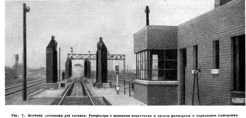 СТАЦИОНАРНЫЕ УСТАНОВКИ ДЛЯ МОЙКИ ВАГОНОВОсновное оборудование. Моечные установки для пассажирских вагонов бывают двух типов: стационарные и передвижные. Стационарные установки состоят из комплектов щеток, смонтированных на стальных колонках, вертикально укрепленных на краю платформы или площадки. Во многих случаях применяют две площадки; на одной из них производится чистка вагона моющими или очищающими растворами, на другой—ополаскивание. С каждой стороны поезда обычно установлено по три колонки с движущимися и вращающимися с помощью мотора щетками, из которых две колонки имеют длинные щетки и служат для мойки боковых сторон вагона и одна колонка помещается посредине и имеет короткие щетки для того, чтобы предохранить при мойке окна вагонов от повреждения. Щетки отводятся сжатым воздухом, управляемым оператором, который находится в здании, расположенном в месте, удобном для наблюдения и контроля. Разбрызгивание моющих веществ на вагоны производится или воздухом или насосом, управляемыми оператором. Действие очищающих веществ более эффективно, если они остаются на поверхности короткое время после наложения, в связи с этим расстояние между очищающими и моечными площадками должно быть, по меньшей мере, 30,5 м. Щетки очищают вагоны, покрытые моющим раствором, после чего вагоны передвигаются к площадке для ополаскивания и обрызгиваются водой из форсунок. После этого щеточное устройство аналогичной конструкции смывает раствор и заканчивает операцию чистки. С появлением вагонов с обзорным куполом на крыше щетки, имеющие горизонтальное вращение, стали применять для чистки куполов и крыш вагонов. Эти щетки выдвижные и действуют так же, как и боковые щетки. Моечные площадки Моечные площадки должны быть построены из железобетона. Приемлемые размеры площадки имеют ширину 6 100 и длину 30 500 мм. Минимальная толщина верхней плиты площадки равна 457 мм. У площадки должен быть уклон к центру — к сточному желобу, ведущему к спускному колодцу. Чтобы колодцы не засорялись щеточным ворсом, они должны быть тщательно прикрыты сеткой. В местах мойки должны применяться короткие шпалы. Очищающие материалы. Чтобы обеспечить эффективность удаления загрязнений (пыль, масло и ржавчина), очищающие материалы должны иметь такие химические свойства, которые обеспечивали бы быстроту действия и в то же время устраняли возможность повреждения бетонных поверхностей и стальных частей моечного прибора. Рекомендуется применять очищающие материалы с ингибиторами (замедлителями), так как это значительно уменьшает повреждения открытых поверхностей. Для защиты бетонных поверхностей моечных площадок к бетону добавляется жидкое стекло. Другим способом предохранения поверхностей является покрытие их слоем специально приготовленного асфальта толщиной от 25,4 до 38,1 мм или других химических и маслостойких материалов. Считают, что оба способа одинаково успешно содействуют уменьшению повреждений бетонных поверхностей. Практика многих моечных установок показала, что очищающие растворы оказывают сильное корродирующее действие на стальные цистерны, обычные насосы и стальные трубопроводы, что требует больших расходов по замене деталей и уходу. Чтобы избежать этого, некоторые железные дороги применяют растворные баки, покрытые внутри резиной, и насосы
