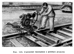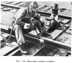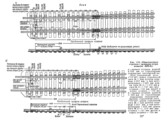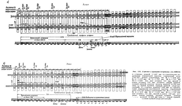 СТРЕЛКИВ комплект стрелки входят следующие элементы: два остряка — правосторонних или левосторонних, в зависимости от ответвления стрелочного перевода от прямого пути вправо или влево; одна (или больше) стрелочная тяга для сохранения определенного расстояния между остряками в горизонтальной плоскости и устранения возможности их поднятия; подкладки и стрелочные подушки для поддержания остряков на должном возвышении по отношению к рамным рельсам, а также соединения с неподвижными или регулируемыми упорками для сохранения правильного положения рамных рельсов. Вкладыши корневого крепления для обеспечения плотного стыкового соединения в корне стрелки, клещевидные или передвижные серьги для соединения тяг с остряками и металлические предохранители для ног представляют собой дополни- гельные части стрелки. Остряки. Остряки изготовляются из обычных рельсов одного типа с рельсами основного пути, обычно длиной 3 353, 5 029, 5 944, 6 706, 9 144 и 11 887 ми. Чертежи AREA для остряков каждой из указанных выше длин разработаны с подушками постоянной и переменной высоты. В первом случае возвышение остряка сохраняется до корневого стыка и постепенно сводится на нет на примыкающих рельсах прямого и ответвленного путей; во втором случае делается вертикальный изгиб остряка и возвышение кончается ранее корневого стыка (рис. 132). Некоторые дороги имеют переводы марки 1/24 с остряками длиной 11 887 мм, предварительно изогнутыми; их ставят на переводах с большими скоростями, на входных стрелках двухпутных линий. Стрелочные переводы и съезды AREA имеют преимущественно следующие сочетания стрелок с прямыми остряками и крестовин: стрелка с остряками длиной 3 353 мм — с крестовинами марок 1/5 и 1/6; стрелка с остряками длиной 5 029 мм — с крестовинами марок 1/7, 1/8, 1/9 и 1/10; стрелка с остряками длиной 6 706 мм — с крестовинами марок 1/11, 1/12 и 1/14 и стрелка с остряками длиной 9 144 мм — с крестовинами марок 1/15, 1/16, 1/18 и 1/20. Стрелки с кривыми остряками применяются преимущественно в следующих сочетаниях: стрелка с кривым остряком длиной 3 962 мм — с крестовинами марок 1/5, 1/6, 1/7 и 1/8; стрелка с кривым остряком длиной 5 944 мм — с крестовинами марок 1/9, 1/10, 1/11 и 1/12; стрелка с кривым остряком длиной 7 925 мм — с крестовинами марок 1/14, 1/15 и 1/16 и стрелка с кривым остряком длиной 11 887 мм — с крестовинами марок 1/18 и 1/20. На рис. 133 показаны стрелки с кривыми остряками длиной 11 887 и 7 925 мм. Остряки обычно изготовляются из углеродистой стали, ин гда с наконечниками из легированной стали, и часто по экономическим соображениям применяется их термическая обработка. Остряк имеет полное сечение в корне и сострагивается по подошве почти по всей длинен по головке со стороны рамного рельса приблизительно на половину своей длины; вертикальная строжка заостренного конца простирается почти на 2/6 длины остряка, в результате чего поверхность его головки снижается с 6,4 мм выше рамного рельса до 12,7 мм ниже его. Толщина острия стрелочного остряка равна 3,2 мм, причем имеется два метода боковой строжки остряка. Некоторые дороги делают строжку до толщины 6,4 мм в конце и затем снимают фаску, начиная от точки на расстоянии 610 мм от острия, давая в самом конце толщину 3,2 мм. Другие делают строжку до 3,2 мм в конце без снятия фаски. Самый конец имеет закругление по радиусу 38 мм. ![]() ![]() ![]() Такая обработка дает практически целесообразную фо