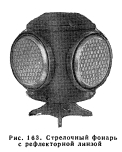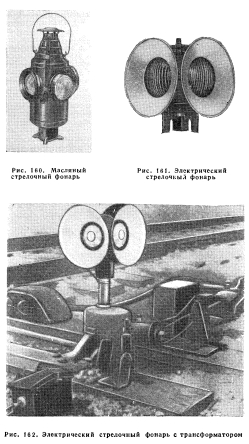 СТРЕЛОЧНЫЕ ФОНАРИСтрелочные фонари в части их конструкции составляют предмет ведения путейцев; самая сигнализация относится к кругу ведения управления сигнализации. AREA одобрила и подтвердила, но без опубликования, указания Сектора сигналов AAR в отношении стрелочных фонарей сферического и цилиндрического типов, утвердила типы резервуаров для масла в каждом типе, а также линзы, крышки, соединительные части, диски — общие для обоих типов. Все фонари, горящие на масле, должны иметь вытяжную вентиляцию. Стрелочный фонарь состоит в основном из металлического корпуса, установленного на раме, горелки и резервуара для горючего; он имеет с четырех сторон стеклянные круглые линзы различных цветов. Линзы противоположных стенок фонаря имеют одинаковый цвет, на главных путях обычно красный и зеленый. У фонаря имеется верхушка, где установлены вентиляционное приспособление, ручка и рожок лампы. Стрелочный фонарь съемный; когда он установлен на осевом стержне, он вращается с поворотом переводного рычага. Для освещения чаще всего применяется специально очищенное масло, но также может быть применен керосин, сигнальное масло, ацетиленовый газ, электричество или свет от прожектора локомотива, отражаемый рефлекторными линзами. Масляные фонари. Стрелочные фонари, горящие на масле (рис. 160), в принципе мало чем отличаются от обычных фонарей, но гораздо более усовершенствованы в зависимости от их специфики и масштаба применения в качестве поездных сигналов. Усовершенствования их конструкции имеются главным образом в отношении вентиляции, которая должна обеспечить равномерную тягу в любую погоду, т. е. создать равновесие между холодным воздухом, проникающим в лампу, и нагретым воздухом, который поднимается от пламени и удаляется через вентилятор. Вентиляционное устройство представляет пустотелый усеченный конус из листового железа, помещенный внутри стрелочного фонаря над рамой суженным концом вверх; основание его приходится на уровне верхушек линз, для того чтобы отвести к стенкам струи холодного воздуха, откуда они опускаются к основанию и, нагреваясь, поднимаются внутрь конуса и выходят через вентиляционное отверстие в верху стрелочного фонаря: пространство над осветительной частью фонаря служит воздушной камерой. ![]() Чтобы сократить время на уход за фонарями, однодневные лампы в большинстве случаев были заменены долгогорящими горелками с большими резервуарами для масла: круглые фитили горелок и качество масла обеспечивают горение фонарей в продолжение целой недели. Наблюдение за ними требуется только 2 раза в неделю. Электрические фонари. На некоторых железных дорогах используются электрические фонари, которые получают ток от индивидуальных установок или от электросети (рис. 161 и 162). Иногда обычные масляные фонари переделывают на фонари с электрическим освещением, установив патроны электроламп вместо резервуара для масла. Применение сухих батарей и низковольтных долговечных лампочек, а также увеличивающиеся расходы на рабочую силу способствовали тому, что возрос интерес к современным электрическим стрелочным фонарям. Они относительно дешевы и их легко обслуживать. Лишь одно обстоятельство задерживает их широкое применение — административно-хозяйственные споры между службой сигнализации и службой эксплуатации. Л
