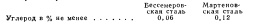 ТЕХНИЧЕСКИЕ УСЛОВИЯ НА КОСТЫЛИ ИЗ СТАЛИ С МАЛЫМ СОДЕРЖАНИЕМ УГЛЕРОДАА. Производство Сталь может быть выплавлена бессемеровским или мартеновским способом. Б. Химический состав и испытания Сталь должна отвечать следующим требованиям по химическому составу: ![]() Определение углерода должно быть сделано для каждой плавки бессемеровской стали 3 раза в каждые 24 ч, или 1 раз за 8 ч; в каждом случае подсчитывается среднее содержание углерода в стали. Эти пробы для анализа должны быть отобраны из стружки, взятой на глубине 3,2 мм опытного слитка, полученного во время разливки стали. Определенный таким образом химический состав должен быть предъявлен заказчику или его представителю и должен соответствовать требованиям, указанным в разделе В части 1. Химические анализы каждой плавки мартеновской стали должны быть сделаны изготовителем для того, чтобы определить содержание углерода в этой стали. Пробы для анализа отбирают из стружки, взятой на глубине 3,2 мм испытываемого слитка, полученного во время разливки стали. Определенный таким образом химический состав должен быть предъявлен заказчику или его представителю и удовлетворять требованиям, изложенным в разделе Б части 1. Изготовитель может по своему усмотрению провести испытания на растяжение вместо химического анализа (раздел 13 части 1). В этом случае готовые костыли должны отвечать следующим минимальным требованиям в отношении физических характеристик металла: ![]() Когда этот выбор сделан, по одному испытанию на растяжение должно быть выполнено не более чем от каждых 1 0 т выплавленной стали, предназначенной для производства костылей. Когда предусматривается медь, процент содержания ее в стали должен быть не меньше 0,20. В. Физические свойства и испытания Готовый костыль в холодном состоянии должен гнуться под углом 180° без трещин на поверхности в месте изгиба. Головка костыля должна отгибаться до приведения ее поверхности к горизонтальному уровню, не допуская трещин на поверхности костыля в месте изгиба. По одному образцу должно быть испытано таким способом не более чем от каждых 5 т. Г. Окончательная отделка Костыль должен иметь размеры, указанные заказчиком, при следующих допускаемых отступлениях: по размерам поперечного сечения костыля +0,8 и—0,4 мм по размерам головки +2,4 и—0,8 мм; по длине от нижней поверхности головки до конца заостренной части ± 3,2 мм; по длине боковой стороны головки костыля ±3,2 мм. Готовый костыль не должен иметь недопустимых повреждений и иметь хорошую оценку. стержня; головка шурупа с круглым основанием для опирания шайбы имеет квадратное или прямоугольное сечение, суживающееся кверху. Полная длина шурупа бывает от 152 до 203 мм. Длина стержня шурупа колеблется в пределах от 127 до 165 мм. Переход от головки к стержню с нарезкой сделан несколько большего диаметра; его длина — от 16,0 до 25 мм. Диаметр стержня, имеющего нарезку, уменьшается книзу на расстоянии от 25,4 до 41,3 мм на величину от 6,5 до 8,0 мм по сравнению с диаметром стержня в том месте, где начинается нарезка. Конец шурупа тупой и имеет диаметр около 12,7 мм. Глубина нарезки — от 3,2 до 4 мм и шаг резьбы — около 12,7 мм. Благодаря тому, что большинство железных дорог приобретают шурупы собственных конструкций, которые в большинстве случаев оказываются удовлетворительными, AREA не предложила какой-либо конструкции и 