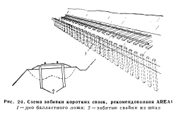 ЗАБИВКА СВАЙ И УСТРОЙСТВО ПЕСЧАНЫХ СВАЙДругим методом укрепления неустойчивого земляного полотна является забивка длинных свай, столбов или старых рельсов в насыпях средней высоты для скрепления слоев из различных насыпных грунтов между собой или забивка коротких сваек из бракованных шпал и обрезков телеграфных столбов в низких насыпях. Для стабилизации насыпей успешно применяются также песчаные сваи. Выбор способа стабилизации насыпи при угрозе оползания откосов в каждом случае должен приниматься в зависимости от местных условий. Деревянные и рельсовые сваи. Забивка деревянных свай или старых рельсов на обочинах насыпей высотой от 2,40 до 12,0 м оказалась весьма хорошим мероприятием для отмены длительно действовавших ограничений скорости движения поездов. Действие свай заключается в непосредственном закреплении грунта насыпи, однако нередко, если свая проходит через увлажненный слой грунта, проникая в лежащий ниже хорошо фильтрующий грунт, образуется вертикальный дренаж. Старые рельсы применяются для той же цели, если в основании насыпи залегают скальные или полускальные породы и применение деревянных свай невозможно. Этот метод применяется также для закрепления насыпей на косогорах. Для успешного осуществления этого способа укрепления насыпей необходимо, чтобы свая вошла в устойчивый грунт на достаточную глубину; например, следует стремиться, чтобы половина сваи вошла в прочный грунт. Сваи забивают обычно на расстоянии от 2,7 до 4,5 м от оси пути и на 0,9—1,5 м одна от другой. Иногда сваи, забитые по обе стороны пути, схватывают между собой стальными тросами, пропуская их под путем, независимо от того, скреплены между собой сваи одного ряда или нет. Сваи обычно забивают небольшим копром, установленным на железнодорожной платформе. Свайки из бракованных шпал. Дешевым способом укрепления неустойчивых низких насыпей или подрельсовой части полотна в выемках является забивка по обе стороны пути обрезков телеграфных столбов или бракованных шпал. До забивки таких сваек с обочин предварительно срезают стругом старый балласт, после чего обрезки столбов или шпал забивают вровень с основной площадкой земляного полотна, чем обычно обеспечивается необходимая устойчивость пути. Свайки забивают не в виде сплошной стенки, а обычно через шпалу, если только по местным условиям не требуется забивка сваек против каждой шпалы (рис. 20). ![]() Хотя для забивки таких сваек и применяют копры на железнодорожных платформах, однако большинство железных дорог, чтобы избежать задержек в движении поездов, предпочитает выполнять эту работу копрами, работающими без занятия пути. Для этого успешно применяются копры, смонтированные на тракторе, а в одном случае был использован специально приспособленный для этой цели рельсоукладчик. Забивку свай производят также за пределами неустойчивого участка с каждого его конца на протяжении одного рельсового звена. Песчаные сваи. Устройство песчаных свай с успехом применяется для стабилизации насыпей высотой до 2,5 м, отсыпанных из глинистых грунтов. Песчаные сваи представляют собой вертикальные дрены, заполненные чистым крупным песком, которые устраивают при помощи деревянного или стального бруса, забиваемого в тело насыпи. Их действие заключается в уплотнении грунта насыпи при забивке бруса и в д