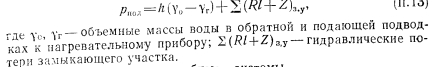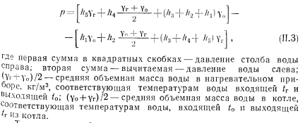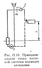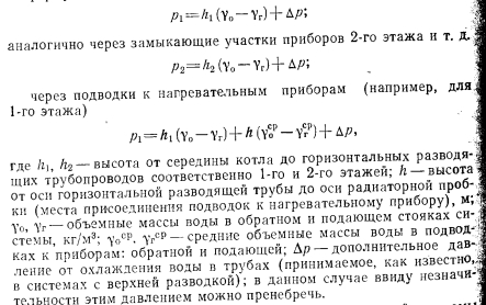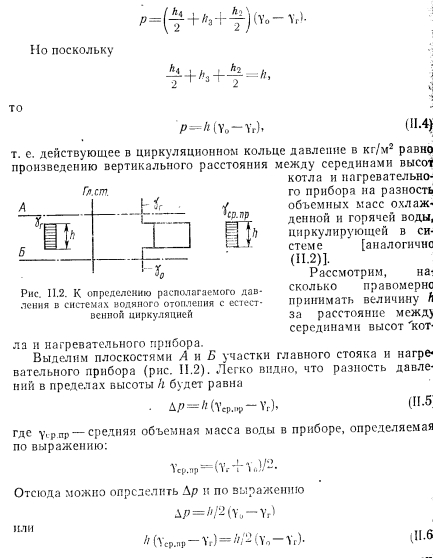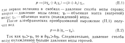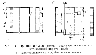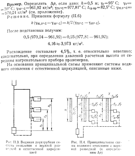 ЦЕНТРАЛЬНЫЕ СИСТЕМЫ ВОДЯНОГО ОТОПЛЕНИЯ С ЕСТЕСТВЕННОЙ ЦИРКУЛЯЦИЕЙПринципиальная схема водяного отопления. В качестве элементарной схемы водяного отопления рассмотрим циркуляционное: кольцо (рис. II.1, а), состоящее из источника тепла (точка нагрева), отопительного прибора (точка охлаждения 2) и трубопровода, соединяющего эти точки. ![]() Циркуляция теплоносителя воды в элементарном кольце происходит следующим образом. Нагретая вода по трубопроводу поднимается вверх, затем опускается вниз и поступает под воздействием естественного давления при неразрывности потока к нагревательному прибору (точка 2); здесь вода отдает часть своего тепла. Oxлажденная по выходе из прибора вода по замкнутому циркуляционному контуру поступает к источнику тепла (котел 1), при этом] вытесняя из него более легкую нагретую воду. Вода в котле, восполнив потери тепла, повторяет свое движение (циркулирует). Какая же сила является причиной циркуляции воды в кольце? Представим, что источник тепла и трубопроводы изолированы от потери тепла так, что вода охлаждается только в нагревательном; приборе. Приняв уровень горизонтального обратного трубопровода за исходный, определим разность гидростатического давления двух столбов воды равной высоты ![]() По формуле (II.2) определяют давление, которое является причиной движения воды в циркуляционном кольце. Рассмотрим простейшую схему водяного отопления с естественной циркуляцией. Система отопления работает следующим образом. После наполнения системы водой из водопровода и удаления из нее воздуха (в данном случае через расширительный сосуд) приступают к нагреванию воды в котле. Процесс циркуляции воды в системе происходит аналогично рассмотренному выше. Пренебрегая потерей тепла в трубопроводе и принимая уровень горизонтального обратного трубопровода за исходный, определим в произвольно выбранном сечении нижней трубы I—I разность давлений от столбов воды с правой и левой стороны; ![]() Так как в данной схеме все количество тепла, вырабатываемое в котле, поступает в нагревательный прибор для нагревания помещения, то при отсутствии потерь тепла трубопроводами объемную массу горячей воды уд в котле и нагревательном приборе можно- принять одинаковой, так же как и объемную массу охлажденной, воды у0, входящей в котел и выходящей из нагревательного при, бора. Выражение (II.3) после алгебраического преобразования примет вид ![]() Уравнение (II.6) должно быть справедливым, так как зависимость объемной массы воды от температуры практически линейная ![]() Водяная система отопления двухтрубная с верхней разводкой и естественной циркуляцией. Как видно из рис. II.3, эта система сложнее по сравнению с принципиальной схемой. В отличие от движешь; воды, поступающей из генератора тепла в один нагревательной, прибор или по одному циркуляционному кольцу, здесь вода поступает в три нагревательных прибора, расположенных в схеме параллельно друг другу или в три циркуляционных кольца через нагревательный прибор. Дельцом водяной системы отопления называется замкнутый контур состоящий из последовательно расположенных участков системы и проходящий через один из нагревательных приборов. Систему называют двухтрубной потому, что она имеет две самостоятельные трубы для питания нагревательных приборов горячей водой и для отвода охлажденн