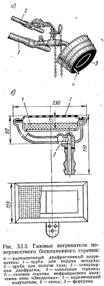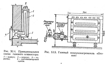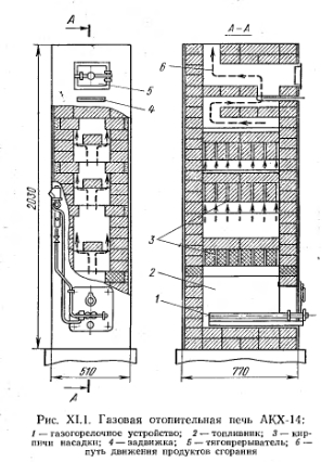 ГАЗОВОЕ ОТОПЛЕНИЕГаз широко применяют в системах теплоснабжения, в том числе для отопления зданий. Центральные системы отопления получают теплоноситель от крупных котельных, использующих в качестве топлива природный газ. В системах квартирного отопления в качестве генераторов тепло применяют газовые нагреватели емкостного типа АГВ-80. Разработаны конструкции печей, приспособленных для сжигания газа (например, газовая отопительная печь АКХ-14, отопитель на я газовая печь АКХ СМ-1). Разработан способ переоборудования бытовых печей на газовое топливо: в поддувальное пространство печей устанавливают эжекционные щелевые горелки. Воздух подается через специально сделанное в дверке зольника регулируемое отверстие сечением 20Х Х20 мм. В задвижках печи для постоянной вентиляции внутреннего пространства устраивают (прожигают) 2 или 3 отверстия диаметром 25 мм. Сравнительно широко применяется инфракрасное газовое отопление, состоящее из излучателей с горелками беспламенного горения. Находят применение такие системы отопления, в которых нагревательными приборами являются конвекторы. Газовые печи. Применение газа в качестве топлива позволяет создать более удобные в эксплуатации конструкции печей, а также полностью автоматизировать их работу. С этой целью в газифицируемых городах Советского Союза перекладываются существующие печи. Однако в этих случаях большая теплоемкость и периодичность действия (топки) печи, как правило, сохраняются прежними. Периодичность действия таких печей увеличивает неравномерность в графике газопотребления города, вследствие чего возникает необходимость увеличения диаметров распределительных газопроводов и’ числа регуляторных станций. Лучшими для перевода на газ являются печи длительного горения. Они обеспечивают более постоянную температуру помещения в течение суток, меньший часовой расход газа, что положительно сказывается на режиме работы (снижается неравномерность графика потребления газа) городской газовой сети. Конструкция печи, предназначенной для сжигания газа, представлена на рис. XI. 1. Эта печь отличается от печи периодического действия увеличенным объемом топливника. Тепловое напряжение топочного пространства Q/V снижено в печи АКХ-14 до 90 000 ккал/м3-ч вместо 250 000—300 000 ккал/м3-ч в печах периодического действия. ![]() В связи с уменьшением теплового напряжения топочного пространства отпадает необходимость в футеровке стенок топливника, топливники в печи АКХ-14 выполняют толщиной в /г красного Кирпича. Ряд прямоточных каналов, образованных между кирпичами, подавленными в 3 яруса один над другим, увеличивает поверхность печи на сравнительно коротком пути. Специальные рассекатели в виде кирпичей, положенных плашмя, направляют продукты сгорания непосредствено к боковым стенкам печи. Над верхним сборным газоходом устанавливают тягопрерыватель для предохранения топки от избыточной и обратной тяги. Печь снабжена приборами защитной автоматики, прекращающей подачу газа в горелки при отрыве или при угасании пламени, и терморегулирующей автоматикой, включающей и выключающей подачу газа на горение в зависимости от температуры кладки печи. При равномерном прогреве, по периметру в помещениях печь АКХ-14 имела к. п. д. 88—90%, создавая неизменный температурный режим. Практика эксплуатации п