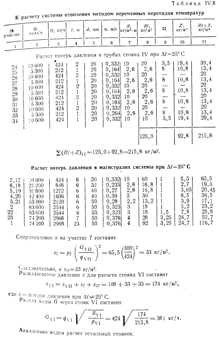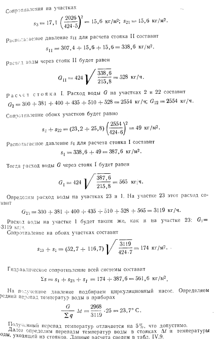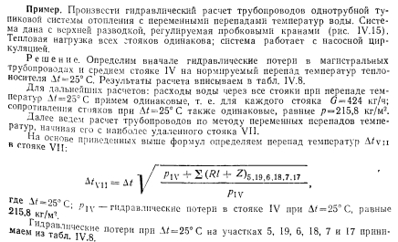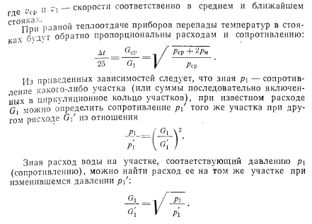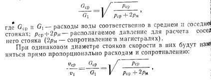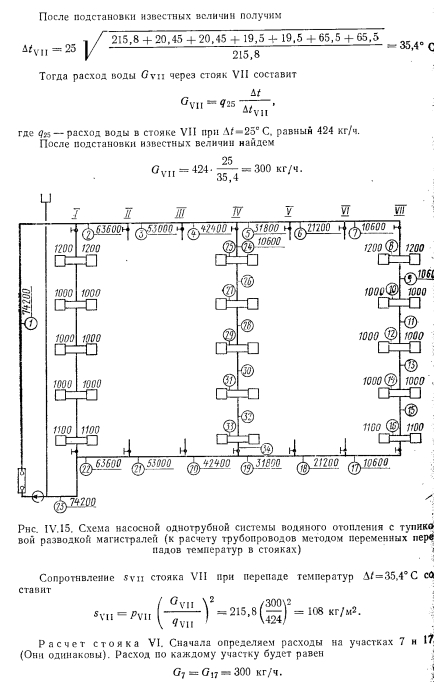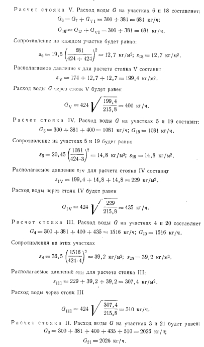 ГИДРАВЛИЧЕСКИЙ РАСЧЕТ СИСТЕМ ВОДЯНОГО ОТОПЛЕНИЯ МЕТОДОМ ПЕРЕМЕННЫХ ПЕРЕПАДОВ ТЕМПЕРАТУРСложность увязки давлений в однотрубных системах приводи к тому, что в каждый нагревательный прибор поступает масса воды, непропорциональная расчетной теплоотдаче, т. е. возникает недогрев или перегрев приборов отопления. Одним из способов решения задачи является метод расчет трубопроводов, при котором для дальних стояков принимают больший перепад, а для ближайших — меньший перепад греющей воды что позволяет удовлетворительно увязать давления между общим точками циркуляционных колец. Метод расчета трубопроводов, предложенный А. И. Орловым 1932 г., сводится к последовательному определению количеств воды, которое должно протекать по каждому стояку с тем, чтоб потери во всех циркуляционных кольцах были одинаковыми. Кроме того, применяя расчет по методу переменных перепадов температур, можно удовлетворительно, с увязкой давлений в кольца рассчитать систему при любом располагаемом давлении. При таком методе расчета все диаметры труб стояков, как пр вило, принимают одинаковыми. Поверхность нагревательных пр боров рассчитывают по скользящим перепадам температур вод; протекающей по каждому из стояков системы отопления. При это суммарная поверхность приборов должна быть не больше, чем системах, рассчитываемых обычным методом. К расчету по скользящему перепаду температур следует переходить в случаях, когда потери давления в циркуляционных кольца будут отличаться от полученных при расчете обычным способов друг от друга больше чем на 15—25%. Расчет удобно начать со среднего стояка ветви, приняв него нормируемый перепад температур, равный, например, Д = 2 В основе расчета других стояков используют зависимости, пр веденные ниже. Расходы воды изменяются пропорционально корню квадратному из действующего давления. Например, ![]() ![]() Таким образом, для выполнения расчета системы способом переменных перепадов температур нужно знать сопротивления участков сети при постоянном перепаде температур, например при Д/ = = 25° С. Поэтому первоначально расчет трубопроводов системы отопления выполняют обычным методом, т. е. при постоянном перепаде температур. ![]() ![]() ![]() ![]() ![]() ![]() После расчета трубопроводов и выявления расходов воды в от дельных стояках определяют температуры воды при входе и выходе в каждом нагревательном приборе. Найденные температуры теплоносителя позволяют определять поверхности нагревательных приборов. Метод расчета систем отопления с переменными перепадами температур в стояках позволяет не учитывать естественное давление, ввиду его незначительности в сравнении с искусственным. Это? приводит к незначительному запасу поверхностей нагревательных; приборов. Дроздов В. Ф. Отопление и вентиляция. Отопление. Учебник для строит, вузов. М., «Высш. школа», 1976 |