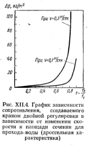 ГИДРАВЛИЧЕСКАЯ ХАРАКТЕРИСТИКА РЕГУЛИРОВОЧНОГО КРАНА, УСТАНОВЛЕННОГО НА ПОДВОДКЕ К НАГРЕВАТЕЛЬНОМУ ПРИБОРУВ водяных системах отопления для регулирования теплоотдачи возникает необходимость изменять количество поступающей воды в нагревательный прибор (количественная местная регулировка). Этот способ регулирования основан на изменении гидравлического сопротивления проходу воды в прибор с помощью крана, установленного на подающей подводке. При изменении проходного сечения в кране давление жидкости в трубопроводе снижается вследствие внезапного расширения потока. Потери давления можно определить в кг/м2 по формуле Борда — Карно, согласно которой потеря при внезапном расширении равна скоростному давлению потерянной скорости ![]() Определение величины гидравлического сопротивления, возникающего в зависимости от степени закрытия крана двойной регулировки. Для решения этой задачи произведем расчеты для трубы с краном двойной регулировки d= 15 мм. Примем скорость потока в трубе V = 0,3 м/с и о2=0,1 м/с (v2— скорость воды в кране). Воспользуемся формулой Борда — Карно (пренебрегая другими потерями в кране) для определения А р. Результаты расчетов приведены в табл. XII.5. ![]() ![]() В табл. XII.5 f2 — площадь отверстия в кране после дросселирования; f 1 — площадь сечения трубы (или отверстия в полностью открытом кране); 1—f2/f—относительная величина площади закрытой части отверстия в кране после дросселирования. Из таблицы и рис. XI 1.4 следует, что кран не является совершенным прибором для регулирования: ощутимое гидравлическое сопротивление кран создает, будучи закрытым более чем на половину, — при скорости воды в подводящей трубе, равной 0,3 м/с, когда отверстие в ней закрыто на 60%, а также при скорости потока в трубе 0,1 м/с, когда она закрыта на 80%. О месте установки крана регулирования нагревательного прибора. Кран регулирования можно устанавливать в водяных системах на подающей и обратной подводках к нагревательному прибору. Где же лучше его устанавливать? Кран действует как запорное и регулирующее устройство, хотя и не совсем совершенное, будучи установленным и на подающей, и на обратной подводках. Как показали наблюдения, если кран установлен на подающей подводке и даже полностью закрыт, возможна циркуляция воды через обратную подводку. В ней устанавливается двухфазное течение потока с взаимно противоположным направлением. Циркуляция эта незначительна — при ней в приборе происходит незначительный теплообмен, что практически всегда допустимо. Для полного отключения прибора и лучшего регулирования теплоотдачи кран предпочтительнее устанавливать на обратной подводке. Однако кран двойной регулировки на обратной подводке может служить причинами засора и недостаточного прогрева прибора. Заметим также, что кран двойной регулировки целесообразнее устанавливать на горизонтальной трубе шпинделем горизонтально. В этом случае из подводки легче удаляется воздух, задерживаемй перед краном вследствие особенностей его конструкции. Автоматизация систем отопления. Анализ работы систем отопления показал, что качественная эксплуатация их практически неосуществима без широкого внедрения во все ее звенья надежной автоматики. От принципа стабилизации температурного режима отапливаемых помещений целесообразен переход на программное регул