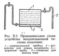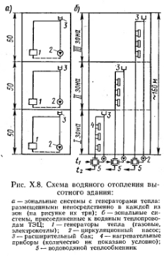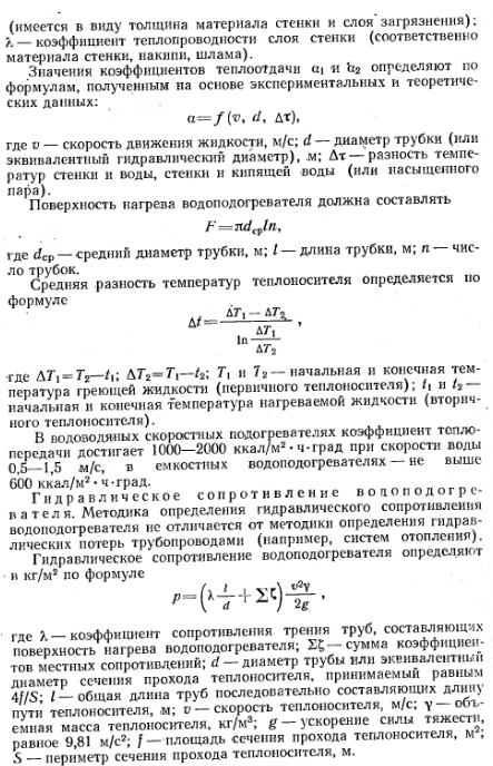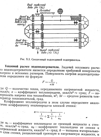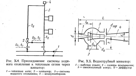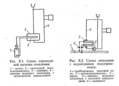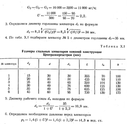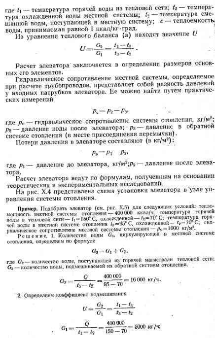 КОМБИНИРОВАННЫЕ СИСТЕМЫ ОТОПЛЕНИЯКомбинированными системами отопления называют такие, в которых, как правило, имеются два теплоносителя: первый — греющая среда, второй — нагреваемая среда или теплоноситель собственно системы отопления. К комбинированным системам относят: центральные пароводяные системы, водоводяные, паро- и водовоздушные (рассмотренные выше), системы с использованием перегретой воды и пара. Рассмотрим некоторые из названных систем. Центральная пароводяная система (рис. Х.1) применяется в тех случаях, когда генераторами тепла служат паровые котлы, вырабатывающие пар для технологических нужд предприятий. Установка работает следующим образом. Пар из котла 1 поступает в емкостный водонагреватель 2, в змеевике 3 которого пар конденсируется, отдавая скрытое тепло парообразования (конденсации) циркулирующему через водонагреватель теплоносителю (веде) системы отопления. ![]() Ввиду относительно больших размеров водоподогревателя скорость воды в нем мала. Следовательно, невелико и гидравлическое сопротивление водоподогревателя, вследствие чего можно применять систему пароводяного отопления с естественной циркуляцией, как показано на рис. Х.1. Относительно большая емкость водоподогревателя, а следовательно, и большая его теплоаккумулирующая способность позволяют регулировать теплоотдачу системы отопления пропусками, т. е. подавать пар в водоподогреватель с перерывами. Теплопроизводительность емкостного подогревателя зависит от величины поверхноетшзмеевика, устраиваемого обычно из U-образ- ных трубок. На рис. Х.2 показана система отопления с водоводяным подогревателем, обычно называемым скоростным (рис. Х.З). В таком водо- подогревателе первичным теплоносителем служит перегретая вода (150° С), получаемая из тепловых сетей ТЭЦ. Вторичным теплоносителем здесь является вода собственно системы отопления. Вследствие относительно большого гидравлического сопротивления водоподогревателя системы отопления устраиваются, как правило, в насосной циркуляцией (что и показано на рис. Х.2). В водонагревателях скоростного типа первичным теплоносителем может служить пар. Применение перегретой воды объясняется технико-экономическими соображениями. Системы отопления, имеющие в качестве генератора тепла водоподогреватели, в принципе не отличаются от рассмотренных выше, но вместо водогрейных котлов применяют паро- и водонагреватели. ![]() ![]() ![]() Гидравлическое сопротивление в скоростных водоподогревателях может составлять 1000—9000 кг/м2. Широко распространен способ присоединения местных систем отопления к тепловым сетям ТЭЦ через элеватор (рис. Х.4), предложенный проф. В. М. Чаплиным в 1903 г. Элеватор предназначен для смешивания горячей и охлажденной воды. Он состоит из следующих элементов (рис. Х.5): рабочего сопла 1, через которое под давлением поступает горячая вода ъз ![]() Работа элеватора состоит в следующем. Горячая вода, проходя по соплу, приобретает при выходе из него большую скорость. Давление при этом в камере всасывания снижается до величины меньшей, чем в патрубке, через который поступает охлажденная вода. Вследствие этого охлажденная вода подсасывается в камеру всасывания и смешивается с горячей водой из сопла. Главной характеристикой элеватора является коэффициент подмешивания U, т. е. Отношение веса подмеши