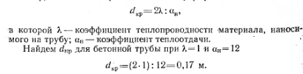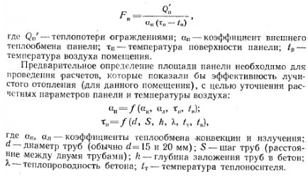 КОНСТРУКЦИИ ОТОПИТЕЛЬНЫХ ПАНЕЛЕЙ И ИХ РАСЧЕТНагревательные элементы отопительных панелей. Для теплоносителя-воды используют стальные трубы бесшовные и сварные, обычно диаметром 15 и 20 мм. Преимущества таких труб: прочность, простота и надежность сварных соединений. Линейный коэффициент их расширения близок к коэффициенту расширения бетона (в определенном диапазоне температур). Следует иметь в виду, что при заделке греющих труб в бетон теплосъем с их поверхности возрастает по сравнению с теплоотдачей труб, расположенных открыто, вследствие увеличения внешней теплоотдающей поверхности. Пределом увеличения толщины стенки является ее критический диаметр, значение которого находим из формулы ![]() Следовательно, стальная труба (например, наружным диаметром 20 мм с толстой бетонной рубашкой) будет передавать окружающей среде тепла больше, чем голая труба, а при е?Кр>0,17 м термическое сопротивление будет возрастать. Теплоотдача труб возрастает с увеличением объемной массы бетона, так как при этом возрастает теплопроводность. Вследствие этого целесообразно применять тяжелый бетон. С целью сокращения расхода стальных труб можно применять бетонные отопительные панели с греющими чугунными элементами вместо стальных труб. Расход чугуна на изготовление нагревательных приборов такого типа уменьшается почти в 1,5 раза по сравнению с конвекционными системами. Из неметаллических труб, используемых для греющих панелей, особенно перспективны термостойкие пластмассовые трубы, несмотря на сравнительно низкий коэффициент их теплопроводности. Их преимущества: пониженный коэффициент трения (уменьшается- гидравлическое сопротивление змеевиков) и коррозионная стойкость. В бетонных отопительных панелях применяют стеклянные змеевики. Методика теплового расчета отопительной панели. Предварительно задаются температурой воздуха /в и температурой поверхности панели тп, после чего определяют площадь панели ![]() Дроздов В. Ф. Отопление и вентиляция. Отопление. Учебник для строит, вузов. М., «Высш. школа», 1976 |