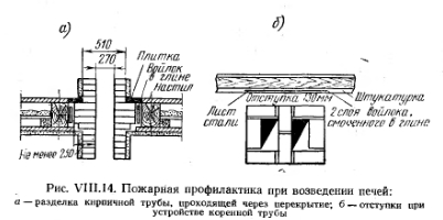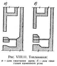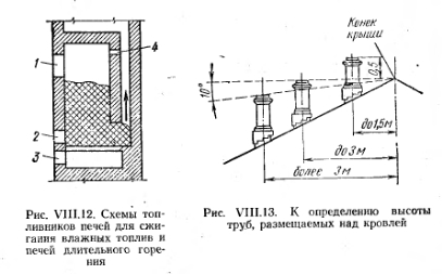 ОСНОВНЫЕ КОНСТРУКТИВНЫЕ ЭЛЕМЕНТЫ ПЕЧЕЙОснования печей. Печи массой до 750 кг по нормам допускается устанавливать на балках перекрытия с предварительным расчетом их на прочность. Отопительные печи массой более 750 кг должны иметь собственные основания. Печи, расположенные на первом этаже, устанавливают также на отдельных фундаментах. Глубина заложения фундамента для печей должна быть не менее 0,5—0,6 м. Топливники должны быть приспособлены для сжигания топлива, на которое рассчитана печь. Различают следующие основные типы топливников: для сжигания дров, сжигания каменного угля, влажного топлива и природного газа (с соблюдением специальных требований и условий). Конструктивные отличия топливников для сжигания дров от топливников для сжигания каменного угля указаны в табл. VIII.1. ![]() На рис. VIII.II изображены топливники для сжигания дров и каменного угля. В топливнике для сжигания дров лежащие на колосниковой решетке дрова пронизываются поступающим из поддувальной дверцы воздухом. Регулируют поступление воздуха различной степенью открытия поддувальной дверцы. В топливнике для сжигания каменного угля для обеспечения требуемых условий сгорания каменного угля устраивают неглубокую шахту (140—210 мм). Колосниковую решетку желательно устраивать подвижной для шуровки каменного угля с целью удаления шлака. ![]() Топливники устраивают из обыкновенного глиняного кирпича. В печах для сжигания каменного угля или антрацита стенки топливника кладут из огнеупорного кирпича или футеруют огнеупорным кирпичом (толщиной в lU кирпича). Из-за различия температурных деформаций кладку из обыкновенного кирпича и огнеупорного не перевязывают. Топливники печей для сжигания влажного топлива. Схемы устройства топливников печей для сжигания влажного топлива и топливников печей длительного горения аналогичны. На рис. VII 1.12 показана схема топливников такого назначения. Небольшая порция топлива загружается на колосниковую решетку. После розжига бункер топливника загружают топливом. Горение его происходит в нижнем слое, и по мере сгорания топливо оседает. Водяные пары при сжигании влажного топлива после подсушки удаляются в дымовой канал через небольшое отверстие 4 под перекрытием топки. Топка имеет три дверки; верхняя дверка I — загрузочная, средняя 2 — шуровочная, нижняя 3 — поддувальная. Кладку печей ведут из хорошо обожженного кирпича на глинопесчаиом растворе со швами толщиной до 5 мм. Выкладывать печи из силикатного кирпича не допускается ввиду того, что такой кирпич разрушается при высокой температуре. Не употребляется для кладки также недожженный кирпич из-за его хрупкости и пережженный, так как поверхность последнего плохо соединяется с глиняным раствором. Раствор, применяемый при кладке печей, должен быть пластичным. Песок для приготовления раствора применяют кварцевый мелкозернистый. Состав раствора: на 1 часть глины 1 часть песка; при жирной глине на 1 часть глины 2 части песка. Толщина шва-— до 5 мм. ![]() Кладку топок из огнеупорного кирпича ведут на растворе из огнеупорной глины и мелко измельченного шамота в пропорции 1:1. При кладке обязательна ее перевязка вертикальных швов. Толщина шва — до 3 мм. Трубы насадные и коренные выкладывают из кирпича на обычном известковом растворе. Печные приборы, к которым относятся колосники, запорно-рег