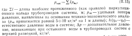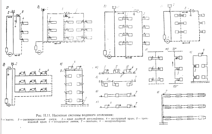 НАСОСНЫЕ СИСТЕМЫ ВОДЯНОГО ОТОПЛЕНИЯПринципиальная схема водяного отопления с насосной циркуляцией показана на рис. 11.10. Эта схема устроена с верхней разводкой, причем 1 — насос, 2 — воздухосборник. Применение для циркуляции воды насоса внесло изменения и в конструктивное оформление системы отопления по сравнению с конструкцией систем отопления с естественной циркуляцией. Эти изменения следующие: воздух из насосной системы водяного отопления удаляется не через расширительный сосуд (как в системах с верхней разводкой и естественной циркуляцией), а через специальные устройства для спуска воздуха. Расширнтельный сосуд, как правило, присоединяется к обратной магистрали перед насосом (см. ниже). ![]() ![]() На рис. 11.11 показаны насосные системы водяного отопления; на рис. 11.11, а — система двухтрубная с верхней разводкой, на рис. 11.11, б — с нижней; применяют их в зданиях не более трех этажей. Системы с нижней разводкой применяют чаще для отопления бесчердачных зданий. На рис. 11.11, в изображена однотрубная система отопления с замыкающими участками. Применяют ее для отопления жилых, общественных и промышленных зданий высотой более трех этажей. Для отопления общественных и промышленных зданий, в которых не требуется местная регулировка нагревательных приборов, применяют однотрубные системы отопления (рис. 11.11, г). На рис. 11.11, д показана однотрубная горизонтальная система отопления с замыкающими участками, применяемая для отопления общественных и промышленных зданий. Показанная на рис. 11.11, е вертикальная однотрубная система отопления с нижней разводкой применяется для отопления жилых и общественных зданий. Воздух удаляется из системы при помощи воздушных кранов, установленных в приборах верхнего этажа. Регулировка теплоотдачи нагревательных приборов производится трехходовыми кранами. ![]() Положительной стороной данной системы отопления является свободное удаление воздуха и отсутствие воздушных кранов. Приборы, установленные в первой части горизонтальной ветви; при температуре теплоносителя от 150—105° С включаются по схеме движения снизу вверх, а в хвостовой части ветви при температуре 105° С и ниже — по схеме сверху вниз» для улучшения теплопередачи приборов (при подаче теплоносителя сверху вниз» Р4=ГГ, а при подаче снизу вверх» р4<1). На рис. 11.11, и показана горизонтальная проточная система, отличительной особенностью которой является прокладка специальной воздушной линии через верхние ниппели приборов, что исключает необходимость установки воздушных кранов на каждом и приборов (см. рис. 11.11, к). Недостатком схемы 11.11, и и 11.11 является жесткое соединение по всей линии, что не допускает компенсации тепловых удлинений, отсутствие которой приводит воды в местах соединений. Проточно-регулируемая однотрубная с верхней разводкой с смещенными замыкающими участками система (рис. 11.11, л) является компромиссным решением. В ней совмещены режимы работы двух однотрубных систем: проточной и с замыкающими участками. Соответствующим регулированием трехходовых кранов на подводках к приборам можно перевести систему на режим работ: проточной системы, когда коэффициент затекания а=1, или Щ режим работы однотрубной системы с замыкающими участкам. На рис. II.11, м показана схема однотрубного стояка системы опрокинутой циркуляцией воды со смешанными з