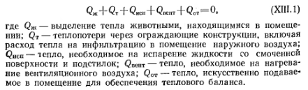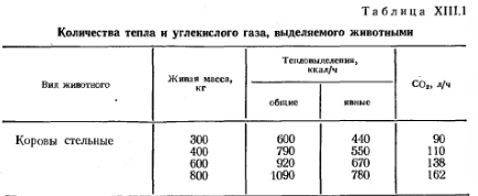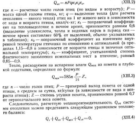 ОТОПЛЕНИЕ ЖИВОТНОВОДЧЕСКИХ ПОМЕЩЕНИИДля поддержания нормальных физиологических процессов, происходящих в организме животных, в помещениях нужно поддерживать определенную температуру и влажность. Кроме того, объемное содержание С02 в животноводческих помещениях должно быть не более 0,25%. Подвижность воздуха в зимнее время должна находиться в пределах 0,3—0,5 м/с, летом же она может быть намного больше (до 1,5 м/с). При проектировании отопления в животноводческих помещениях расчетную наружную температуру следует принимать по параметрам Б, т. е. по средней температуре самой холодной пятидневки. Тепловой баланс животноводческого помещения выражают в виде алгебраической суммы поступающего и теряемого тепла: ![]() Количество вентиляционного воздуха определяют как наибольшее из трех значений, полученных при расчете поглощения теплоизбытков, доведении относительной влажности до нормируемой и растворении выделяемых вредных газов до допустимой концентрации (углекислоты и аммиака). Количество вредных выделений животными зависит от целого ряда факторов: породы, веса, возраста, физиологического состояния (табл. XIII.1). Разность температуры воздуха в помещении и внутренней поверхности стены не должна превышать 3°, а температуры воздуха и поверхности покрытия — 2,5°. Полы должны быть теплыми, с этой целью пристенные зоны пола дополнительно утепляют. Разность температуры зоны пребывания животных и поверхности пола не должна быть более 1,5°. Для искусственного обогрева животноводческих помещений можно применять печное, водяное, воздушное и паровое отопление низкого давления. Нагретый воздух нужно подавать через воздуховоды равномерной раздачи. При этом систему воздушного отопления удобно помещать с приточной вентиляцией, воздух в этом случае соответственно перегревается. ![]() Максимальная температура воздуха, подаваемого системой воздушного отопления, не должна превышать 70° С, а максимальная температура поверхности нагревательных приборов — 95° С. Для отопления животноводческих помещений нужно применять локальные системы отопления. Так, в помещениях для содержания свиней, особенно молодняка, целесообразно обогревать полы с помощью змеевиков центрального водяного отопления или способом электрообогрева. Для обеспечения в животноводческих помещениях необходимого микроклимата рекомендуется программное автоматическое управление системами отопления и вентиляции с помощью приборов и аппаратов, отличающихся быстротой и гибкостью регулирования в зависимости от изменения условий (температуры, влажности, времени, скорости движения воздуха и др.). Температуру внутреннего воздуха в птичниках принимают согласно норм в зависимости от места нахождения птиц в помещении: на полу или в местах локального обогрева, под брудевами или при содержании их в клетках. Кроме того, внутренняя температура воздуха зависит от возраста птиц и их вида. В птичниках полуоткрытого и открытого типа параметры внутреннего воздуха помещения для содержания птиц не нормируются. При расчете теплопроизводительности системы отопления следует учитывать тепловыделения от птиц и расход тепла на испарение влаги из помета и глубокой подстилки. Количество тепла, выделяемое птицами QnT, определяют по формуле ![]() Отопительные устройства. Систему отопления выбирают