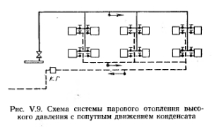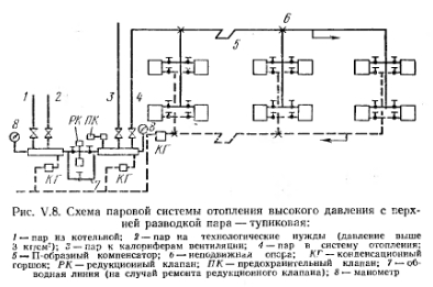 ПАРОВЫЕ СИСТЕМЫ ОТОПЛЕНИЯ ВЫСОКОГО ДАВЛЕНИЯПаровыми системами отопления высокого давления называют системы с давлением пара от 0,7 до 3 кг/см2. Верхний предел давления пара лимитируется в основном механической прочностью нагревательных приборов. Количество тепла, получаемого нагревательным прибором, равняется ![]() При охлаждении перегретого пара до состояния насыщения тепла выделяется меньше по сравнению со скрытой теплотой парообразования. Кроме того, коэффициент теплоперехода перегретого пара и — невелик, он равен 200—300 ккал/м2 ч-град (перегретый пар обладает свойствами газов), тогда как насыщенный пар имеет а=10 0С0 ккал/м2-ч град. Поэтому перегретый пар в качестве теплоотдающей среды применять нецелесообразно — увеличивается поверхность нагревательных приборов. Паровые системы отопления высокого давления, как правило, получают пар от отопительно-производственных котельных. Такие системы отопления применяют с верхней, нижней и средней разводками пара; тупиковые и с попутным движением конденсата. На рис. V.8 показана паровая система отопления высокого Давления с верхней разводкой пара — тупиковая. Пар давлением выше 3 кг/см2 подается из заводской котельной по паропроводу / в парораспределительную гребенку, от которой по ответвлению он поступает на технологические нужды. В системах отопления давление пара снижают при помощи редукционного клапана РК пар поступает в парораспределительную гребенку с давлением не выше 3 кг/см2. На гребенке установлен предохранительный клапан ПК, гарантирующий давление в сети не выше заданного. Если редукционный клапан не снизит давление пара до 3 кг/см2, предохранительный клапан откроется для выпуска пара в атмосферу. От парораспределительной гребенки пар по паропроводу поступает к стоякам и далее к нагревательным приборам. В последних пар конденсируется, отдавая скрытую теплоту парообразования. Конденсат по конденсатопроводам поступает в котельную. В паровых системах высокого давления температура конденсата практически равняется температуре пара, находящегося в приборе, т. е. выше 100° С. Поэтому конденсат в отличие от паровых систем низкого давления удаляется не самотеком, а давлением пара. ![]() В отличие от системы низкого давления в данном случае на подводках к нагревательным приборам (паровой и конденсационной) устанавливают вентили на обеих подводках. При выключении нагревательного прибора следует закрыть оба вентиля. На конденсационной магистрали на группу стояков устанавливают конденсатоотводчик. Конденсат из парораспределительных гребенок удаляется аналогично. При пуске системы высокого давления воздух под давлением пара вытесняется из системы через конденсатопроводы и обходные линии у конденсатоотводчиков. Для компенсации температурных удлинений паропроводов и конденсационной магистрали устанавливают компенсаторы в соответствующих местах системы между неподвижными опорами. Чтобы обеспечить более надежную работу всех нагревательных приборов паровой системы отопления высокого давления, целесообразно устраивать попутную разводку магистральных конденсатопроводов (рис. V.9). Аналогично насосной системе водяного отопления с попутным движением воды в паровой системе отопления длина всех расчетных колец — паровой линии плюс конденсационной — будет одинаков