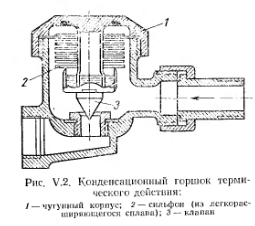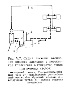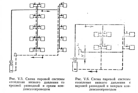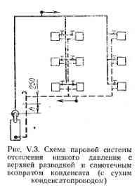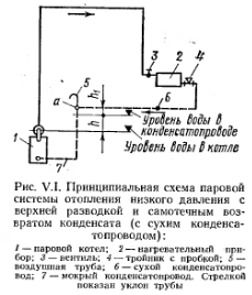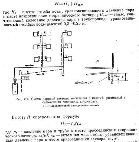 ПАРОВЫЕ СИСТЕМЫ ОТОПЛЕНИЯ НИЗКОГО ДАВЛЕНИЯПринципиальная схема парового отопления низкого давления показана на рис. V.I. Она состоит из трех основных элементов: парового котла, нагревательных приборов, сети трубопроводов. Действие системы состоит в следующем. Вода, которой заполнен генератор тепла — котел до известного уровня, подогревается. После нагревания воды выше 100° С образуется пар, который начинает перемешаться по трубопроводам в нагревательный прибор. Охлаждаясь при соприкосновении со стенками нагревательного прибора, конденсируется. При этом в основном скрытая теплота парообразования через стенки прибора передается отапливаемому помещению. Образовавшийся конденсат возвращается из прибора самотеком по трубопроводам (конденсатопроводам) в котел для повторного превращения в пар. ![]() Так как до куска системы нагревательный прибор и трубопроводы заполнены воздухом, пар может поступить в прибор только после предварительного вытеснения воздуха, как более тяжелой среды. Воздух удаляется из системы, перемещаясь по пути следования пара до нагревательного прибора и далее по конденсатопроводу, перемещаясь параллельно с конденсатом. Таким образом, сечение конденсатопровода должно быть достаточным для перемещения конденсата и воздуха. Конденсатопровод, в котором перемещаются конденсат и воздух, называют условно сухим. Сухой конденсатопровод, прокладываемый с уклоном i = 0,005 для самотечного перемещения конденсата, переходит в вертикальную трубу, занимая полное сечение которой, конденсат возвращается в котел. В точке а, соединяющей горизонтальную трубу с вертикальной, воздух через воздушную трубку удаляется в помещение котельной. Таким образом, паровая система отопления отличается от водяной тем, что в паровой системе отсутствует расширительный сосуд; воздух удаляется из системы не через верхнюю точку ее, а внизу (в подвале, в помещении котельной), перед местом попадания коденсата в котел, через специально устраиваемую воздушную Трубопроводы в паровой системе разделяются на паропроводы, идущие до нагревательного прибора, и конденсатопроводы — отогревательного прибора до генератора тепла. ![]() Контроль за подачей пара к нагревательному прибору можно осуществить установкой на конденсатопроводе за прибором тройника с пробкой (см. рис. V.1). Вывертывая пробку, можно установить регулировкой вентилем на пароподводящен трубе такой режим, при котором -пар будет полностью конденсироваться в приборе. Пар, попавший в конденсатопровод, будет выходить в помещение котельной по воздушной трубе. За каждым нагревательным прибором целесообразнее устанавливать парозапиратель (рис. V.2), который пропускает воздух и конденсат, но препятствует проходу пара. Принцип работы парозапирателя состоит в следующем. Герметическая гофрированная коробка (сильфон) заполнена спиртом. При температура пара коробка растягивается, и прикрепленный к ней конусный золотник закрывает отверстие для прохода пара. При смывании воздухом или конденсатом, температура которого ниже температуры пара, коробка не растягивается и отверстие остается открытым. Давление пара в генераторе тепла слагается из потерь давления на преодоление гидравлических сопротивлений в трубопроводе ZiRl+Z) и в нагревательном приборе, перед вентилем которого обеспечивается 