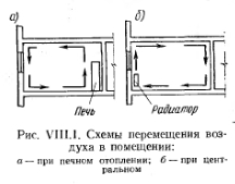 ПЕЧНОЕ ОТОПЛЕНИЕРазвитие отопительной техники началось с печного отопления. Конструкции печей появились в глубокой древности — более 3 тысяч лет тому назад. Но и до настоящего времени печи применяют для отопления небольших (до двух этажей) зданий, строящихся в сельской местности и в малых городах. Применение печей объясняется небольшой стоимостью устройства их по сравнению с другими видами отопления, простотой конструкции и обслуживания. Вместе с тем печное отопление имеет много недостатков. Главными из них являются высокая трудоемкость их индивидуального обслуживания, низкий эксплуатационный коэффициент полезного действия, пожарная опасность, загрязнение помещений топливом, золой, а также уменьшение на 5—8% полезной площади помещений и возникновение токов относительно холодного воздуха (рис. VIII.1). По этим причинам, а также из-за большой трудоемкости сооружения кирпичных печей применение печного отопления сокращается с каждым годом. Каждая печь состоит из следующих основных элементов: топливника для сжигания топлива,, каналов (или камер), по которым перемещаются дымовые газы, и дымохода, отводящего охлажденные газы в атмосферу. Тепло, выделяющееся в результате сгорания топлива, воспринимается топливником и каналами, от которых оно через теплоотдающие поверхности передается в помещение. ![]() Печи характеризуют следующими признаками: теплоемкостью, схемой движения газов внутри печи, толщиной стенок, формой в нйане, этажностью, типом устройства дымоходов (дымовых труб), основным материалом, из которого сложена печь. По теплоемкости печи подразделяют на теплоемкие и нетеплоемкие. К теплоемким относят печи, имеющие объем активно нагреваемого массива не менее 0,2 м3. При этом стенки топливника должны быть не тоньше 6 см, а стенки каналов — 4 см. Теплоемкие печи топят 1—2 раза в сутки. Нетеплоемкие печи — в основном металлические — иногда снабжают футеровкой и топят непрерывно или с небольшими перерывами. Дроздов В. Ф. Отопление и вентиляция. Отопление. Учебник для строит, вузов. М., «Высш. школа», 1976 |