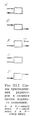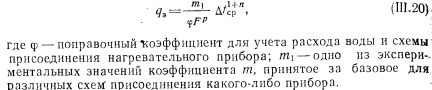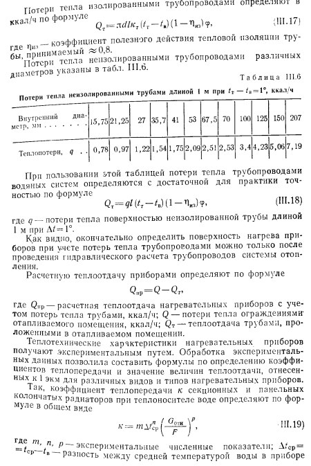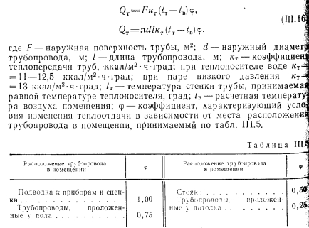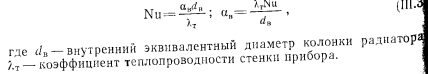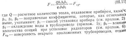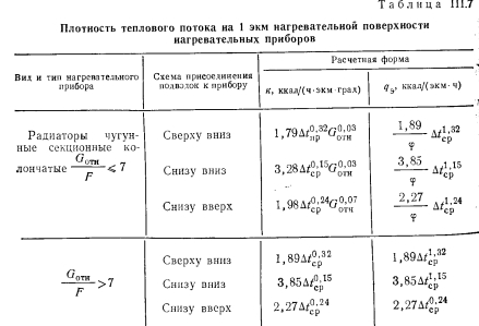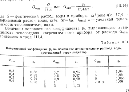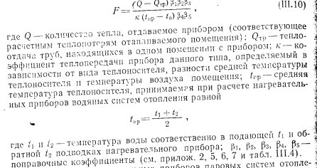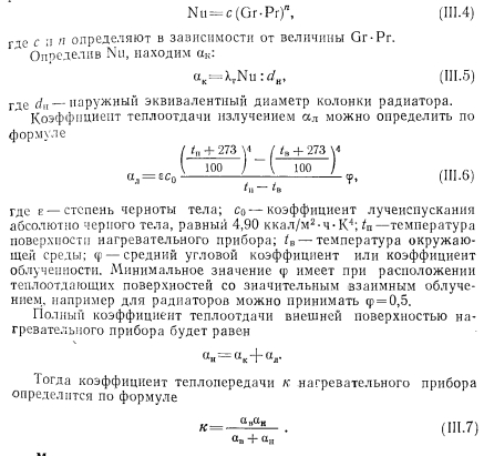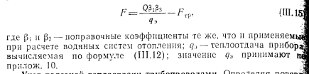 РАСЧЕТ ПОВЕРХНОСТИ НАГРЕВАТЕЛЬНЫХ ПРИБОРОВПоверхностью нагревательных приборов называют всю поверхность, находящуюся в контакте с воздухом помещения. В нагревательном приборе через его стенки происходит теплообмен между протекающим внутри прибора теплоносителем (на гретая вода, пар) и окружающей средой. Уравнение теплового баланса нагревательного прибора имеет следующий общий вид: ![]() Коэффициенты внутреннего и внешнего теплообмена можно определить с помощью безразмерных формул. Для колончатого радиатора теоретически можно определит упомянутые выше коэффициенты теплообмена способом, описанным ниже. Внутренний теплообмен. Коэффициент теплообмена между тете доносителем и стенкой для вынужденной конвекции определяют и уравнения подобия: ![]() ![]() ![]() ![]() Наиболее высокий коэффициент теплопередачи имеют те нагревательные приборы, у которых отношение FU:FB. По этой причине коэффициент теплопередачи ребристых труб меньше, чем гладкостенного прибора, так как Fa:Fв много больше 1,0. Коэффициент теплопередачи нагревательного прибора завися от величины температурного напора, равного разнице температура теплоносителя (поверхности приборе) и температуры воздух помещения; чем больше эта разность, тем выше коэффициент тепло; передачи прибора. Коэффициент теплопередачи одной горизонтально проложенной трубы больше, чем у прибора-регистра, состоящего из нескольких труб, расположенных параллельно друг над другом. Объясняете это тем, что воздух, поднимаясь от труб вверх, нагревается, благодаря чему разность температур поверхности прибора и окружающего воздуха уменьшается, следовательно, снижается и величина коэффициента теплопередачи регистра. Так, при Af = tn—/в = 64,5° коэффициент теплопередачи одной ребристой трубы к = 5, двух труб к—4,5 и трех труб, расположенных друг над другой к = 4 ккал/м2-ч-град. По этой же причине коэффициент теплопередачи низкого радиатора имеет большее значение, чем у высокого. Величина теплопередачи нагревательного прибора зависит о целого ряда факторов, отражаемых поправочными коэффициентам Рь 2, Рз, 4 и Рб, которые учитывают при определении поверхность нагревательных приборов и величин теплоотдачи. Поправочный коэффициент Pi учитывает способ установки нагревательного при, бора. Экспериментально установлено, что коэффициент теплоотдачи прибора зависит от условий его установки; с возрастанием скорости строго направленного потока воздуха около нагревательного прибора коэффициент теплоотдачи увеличивается, что учитываете поправочным коэффициентом Рь ![]() Очевидно, что в системах с верхней разводкой поправочный коэффициент на поверхность прибора будет возрастать сверху вниз (т. е. одновременно с увеличением длины пути движения теплоносителя), а в системе с нижней разводкой— наоборот. В системах с естественной циркуляцией поправочный коэффициент на охлаждение еоды в трубопроводах соответственно имеет более высокие значения, чем для насосных систем. Последнее объясняется относительно большими диаметрами трубопроводов и меньшими скоростями воды в системах с естественной циркуляцией и, следовательно. большим остыванием воды в трубах. Поправочный коэффициент на количество секций р3 в радиаторах вводят в основном при расчете нагревательных приборов водяных систем отопления. Введение коэффициента