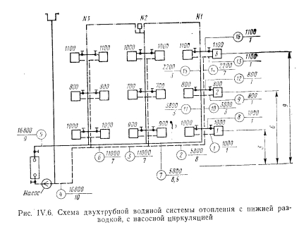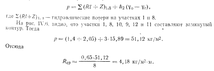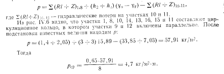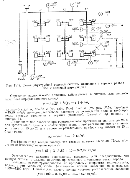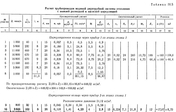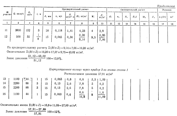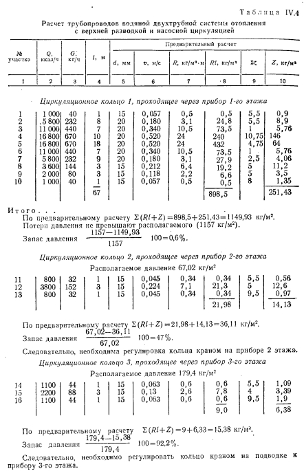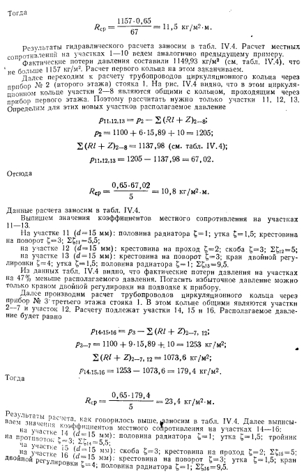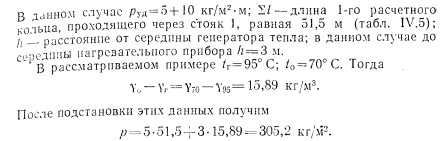 РАСЧЕТ ТРУБОПРОВОДОВ ДВУХТРУБНЫХ СИСТЕМ ВОДЯНОГО ОТОПЛЕНИЯ С НАСОСНОЙ ЦИРКУЛЯЦИЕЙПринципиально расчет трубопроводов водяных насосных систем отопления не отличается от расчета систем с естественной циркуляцией. Однако ввиду большого конструктивного развития последних по сравнению с системами с естественной циркуляцией приемы и методы расчета насосных систем более разнообразны. Пример. Рассчитать трубопроводы насосной водяной двухтрубной системы отопления с верхней разводкой методом удельных потерь давления на трение Решение. Выполним расчет главного (первого) циркуляционного кольца за примем кольцо через нагревательный прибор № 1 (рис IV 51 первого зтажа стояка 1 как наиболее протяженное, характеризующееся наименьшим удельным располагаемым давлением. ![]() ![]() ![]() Из итоговых данных видно, что фактические потери давления на участках 14—16 на 92,2% меньше располагаемого давления. Погасить это избыточное давление можно установкой крана двойной регулировки. Выводы по расчету трубопроводов двухтрубной системы водяного отопления с верхней разводкой и с насосной циркуляцией. 1. Практически удается рассчитать удовлетворительно (с отклонением от располагаемого давления 10%) только 1-е циркуляционное кольцо (через прибор первого этажа). 2. Эта система характеризуется невысокой гидравлической устойчивостью: циркуляционные кольца, проходящие через нагревательные приборы этажей выше первого, имеют избыточное располагаемое давление, превышающее корму (больше 10%). 3. Разница между располагаемым давлением и фактическими потерями в трубопроводах увеличивается одновременно с увеличением расстояния h (расстояние от центра генератора до середины нагревательного прибора), т. е. в кольце, проходящем через прибор верхнего этажа,-эта разница давлении больше, чем в кольце через прибор нижнего. Расчет трубопроводов двухтрубной системы водяного отопления с нижней разводкой и насосной циркуляцией. Схема такой системы показана на рис. IV.6. Котельная, питающая систему, является временной. ![]() ![]() ![]() Как видно, располагаемое давление относительно невелико, если учесть, что системы отопления, присоединенные к тепловым сетям ТЭЦ, могут иметь после узла управления, в котором установлен элеватор, располагаемое давление минимум 1000—1200 кг/м2. Поэтому для рассматриваемого примера трубопровод систем отопления целесообразно рассчитать на давление 1000—1200 кг/м2. Относительно высокое располагаемое давление для циркуляционного кольца протяженностью 51,5 м позволяет вести расчет трубопровода по предельным скоростям. Используя данные таблицы предельных скоростей движения теплоносителя и пользуясь таблицами для расчета трубопроводов, назначаем диаметры участков циркуляционного кольца. Далее заполняют графы 5, 6, 7 и 8 табл. IV.5. В графах 9 и 10 проставляют гидравлические потери на местные сопротивления. Суммарные гидравлические потери по всему кольцу составят 448,02 кг/м2, чго существенно меньше располагаемого давления (1000—1200 кг/м2). Изменяем диаметры на участках 4 и 5 с 15 на 20 мм. Окончательно получим гидравлические потери равными 900,82 кг/м2. На этом расчет 1-го циркуляционного кольца через прибор первого этажа заканчиваем. Переходим к расчету трубопроводов циркуляционного кольца через прибор второго этажа стояка 1. Определяем располагаемое давление в этом ко