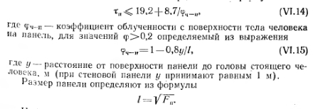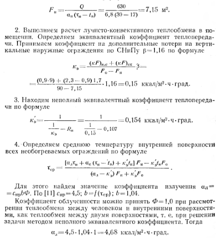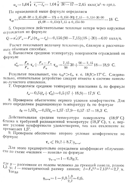 РАСЧЕТНЫЕ ВНУТРЕННИЕ ТЕПЛОВЫЕ УСЛОВИЯ ПРИ ПАНЕЛЬНО-ЛУЧИСТОМ ОТОПЛЕНИИСистемы панельно-лучистого отопления должны удовлетворять определенным параметрам микроклимата. С этой целью делают соответствующую проверку теплового комфорта в помещении. Радиационную температуру /д и температуру внутреннего воздуха /в определяют по формуле ![]() Для большинства помещений жилых и общественных зданий комфортные сочетания tB и 1r могут отклоняться от средних значении на ±1,5°. К радиационному нагреву в организме человека наиболее чувствительна поверхность его головы. Радиационный баланс должен быть таким, чтобы любая элементарная площадка ка поверхности головы человека теряла излучением не менее 10 ккал/м2-ч. Когда отопительные панели расположены в стенах, за расчетное принимают положение человека на расстояние 1 м от нагретой поверхности (второе условие комфортности). Предельно допустимую температуру тп поверхности потолочной или стеновой отопительной панели определяют по формуле ![]() Пример. В помещении требуется устроить потолочное панельно- лучистое отопление. Определить площадь отопительной панели для помещения размерами в плане 3X6 м. Поверхность наружных ограждений стен 9 м2, площадь окна— 1,7 м2, площадь всех поверхностей — 90 м2. Температура внутреннего воздуха = 17е С. Коэффициенты теплопередачи окна к = 2,3 ккал/м2-ч - град, наружной стены к= =0,9 ккал/м2 ч-град; теплопотери определенные обычным методом, составляют 630 ккал/ч при t= —30° С. Решение. 1. Принимая температуру поверхности панели тп= =30° С и коэффициент внешнего теплообмена панели ап= = 6,8 ккал/м2-ч град, определяем предварительно площадь Fu отопительной бетонной панели по формуле ![]() ![]() Находим допустимую температуру потолочной отопительной панели ![]() Так как 33,6°>30°, второе условие комфортности будет удовлетворено. Следовательно, условия теплового комфорта при действии панельно-лучистого отопления в помещении соблюдаются. Теплоносители панельно-лучистого отопления. Основным теплоносителем является вода, обладающая рядом преимуществ: возможностью качественного регулирования; разогревать панели можно при невысокой температуре воды и медленно, что препятствует возникновению трещин. В потолочных системах змеевики можно укладывать почти без уклона, что не допустимо при паре. При теплоносителе-воде внутренняя коррозия может быть ничтожно малой. Пар, не обладающий перечисленными преимуществами, для этой цели почти не применяют. Воздух характеризуется положительно как теплоноситель, однако для него требуются каналы значительных размеров. Кроме того, необходимо тщательно наблюдать за герметизацией систем, что практически осуществлять весьма сложно. Электронагрев имеет один существенный недостаток — он дороже других видов отопления в районах с высоким тарифом а электроэнергию. Дроздов В. Ф. Отопление и вентиляция. Отопление. Учебник для строит, вузов. М., «Высш. школа», 1976 |