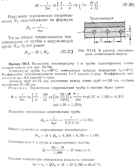 ТЕПЛОВОЙ РАСЧЕТ ЭЛЕМЕНТА БЕТОННОЙ ОТОПИТЕЛЬНОЙ ПАНЕЛИСопротивление теплопередачи бетонной панели тр относят к 1 м трубы, расположенному в ряду труб. Сопротивление при этом-1 зависит от диаметра труб d, расстояния между ними s, глубины расположения от поверхности Я, коэффициента теплопроводности массива, а также от того, как отдает панель тепло с одной или с двух сторон. Термическое сопротивление трубы в массиве (при отводе тепла с одной стороны, рис. III.10) определяют по уравнению ![]() На практике получил распространение расчет бетонных отопительных панелей по составленным на основании экспериментальных данных номограммам и графикам. Зная тепловую нагрузку, температуру теплоносителя и воздуха помещения, выявляют размеры бетонной панели, нагреваемой трубами определенного диаметра с определенным шагом между их осями. Пользуются также графиками для определения теплоотдачи 1 м длины в зависимости от разности расчетных температур и определенных конструктивных параметров размещения в греющей панели змеевиков труб и т. д, Дроздов В. Ф. Отопление и вентиляция. Отопление. Учебник для строит, вузов. М., «Высш. школа», 1976 |