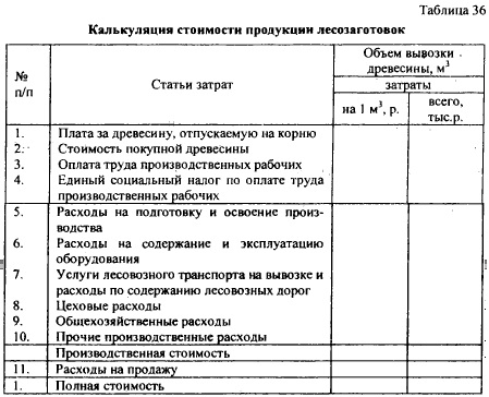 На статью «Услуги лесовозного транспорта на вывозке и расходы на содержание лесовозных дорог» относятся расходы на содержание и эксплуатацию тягового и подвижного состава узкоколейных дорог, лесовозных автомобилей и прицепов, тракторов, занятых вывозкой древесины, а также расходы по содержанию лесовозных дорог, включая погашение расходов по строительству временных магистралей, веток, усов и сезонных дорог. В цеховые расходы включаются затраты на содержание аппарата управления цехов (оплата труда с отчислениями по единому социальному налогу цехового управленческого персонала, расходы по содержанию диспетчерской связи); амортизация, расходы на содержание и ремонт здании, сооружений и инвентаря цехового назначения; расходы, связанные с обеспечением нормальных условий труда и техники безопасности, и другие затраты, связанные с управлением производственными подразделениями. Общехозяйственные расходы связаны с управлением предприятием и организацией производства в целом. В их состав включаются оплата труда с отчислениями по единому социальному налогу работников аппарата управления предприятием, расходы на транспортное обслуживание их деятельности, затраты на командировки, на содержание и обслуживание технических средств управления; оплата консультационных, аудиторских услуг, оплата услуг банка; расходы на подготовку кадров; амортизация и расходы на содержание и ремонт зданий и сооружений общезаводского назначения; платежи по обязательному страхованию имущества предприятия; налоги и сборы, производимые в соответствии с установленным законодательством порядком. Прочие производственные расходы учитывают стоимость древесины и материалов, израсходованных при выполнении вспомогательных работ в лесу при приемке лесфонда, подготовке территории лесосек и очистке мест рубок; производственные потери древесины при раскряжевке хлыстов и разделке долготья на коротьё; оплату подрядных работ, выполненных по договору сторонними организациями (вывозка древесины, распиловка сырья на пиломатериалы и т.д.), стоимость древесины, израсходованной при погрузке в вагоны и др. Расходы на продажу учитывают затраты на тару и упаковку изделий на складах предприятий, на транспортировку и погрузку готовой продукции, а также комиссионные сборы в виде отчислений сбытовым организациям, расходы на рекламу и др. |