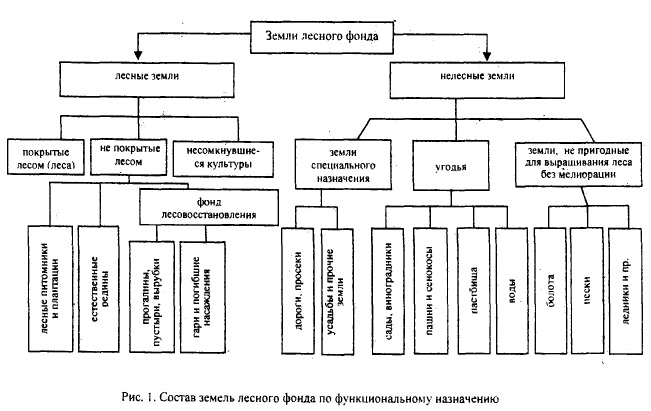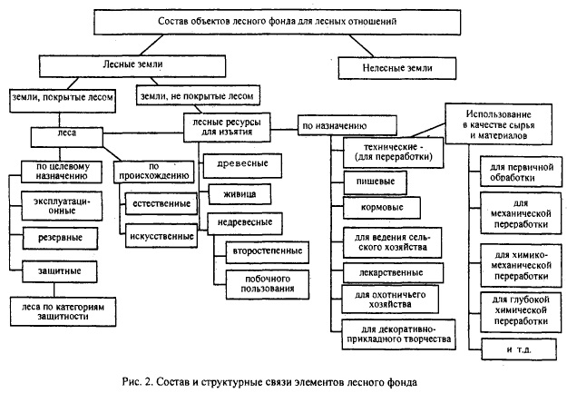 Лесной фонд: общие понятия, состав и характеристикиСогласно Лесному кодексу Российской Федерации (ЛК) использование, охрана, защита, воспроизводство лесов осуществляются исходя из понятия о лесе как об экологической системе или как о природном ресурсе (ст. 5 ЛК) [4]. Природные ресурсы представляют собой тела (элементы) и свойства природы, которые на данном этапе развития производительных сил могут быть использованы в качестве предмета потребления и (или) средства труда и производства. Общественные полезности природных ресурсов изменяются (прямо или косвенно) под воздействием деятельности человека. Природные ресурсы, а также их свойства, не требующие для своего вовлечения трудовых затрат, представляют собой природные условия (температура, климат, осадки и т.д.) [15, 24]. К природным ресурсам относят: • земельный фонд;• растения; • животный мир; • полезные ископаемые; • водные ресурсы; • энергоресурсы и др. Сам лес также является частью природы, природным ресурсом. Именно поэтому Лесной кодекс Российской Федерации дает понятие леса как экологической системы или как природного ресурса. Как природный комплекс, лес содержит в единстве ряд перечисленных видов природных ресурсов, в том числе земельный фонд, древеснокустарниковую и прочукз растительность, животный мир как обязательные компоненты леса, но не все ресурсы являются лесными. Лесные ресурсы это природные ресурсы компоненты леса (его элементы, тела), а также его силы и свойства, пригодные для удовлетворения материальных и культурных потребностей человека и общества. По своему происхождению они характерны только для леса, лес является их «родителем». В лесу могут встречаться не только лесные, но и другие природные ресурсы (например, водные, ископаемые, сельскохозяйственные растения и т.п.), а лесные ресурсы могут иметь место не только в лесу (например, деревья в городе). В то же время каждый из элементов природных ресурсов может быть представлен и на территории лесов, но этого не достаточно для отнесения их к лесным ресурсам: вид ресурса определяется не местонахождением. Так, например, земельные ресурсы не являются лесными, так как своим «появлением» как часть природы они обязаны не лесу, хотя и являются основным условием происхождения леса, они возникли прежде него, и только позже на земном шаре появились леса. Встречается отнесение к лесным ресурсам водных ресурсов в связи с тем, что леса способствуют переводу атмосферных осадков в грунтовые воды, образованию чистых и минеральных вод, в том числе целебных [22]. Водные ресурсы могут находиться в лесу, но по своей природе они не являются лесными даже расположенные в лесном фонде. Они являются отдельным видом природных ресурсов, так как их образованию мог>т способствовать не только леса, переводя атмосферные осадки в грунтовые воды, примером чего является происхождение морей. Леса располагаются на землях лесного фонда и землях иных категорий (ст. 6 ЛК). Земли лесного фонда это часть земельного фонда России, выделенная для ведения лесного хозяйства. Основными территориальными единицами управления в области использования, охраны, защиты, воспроизводства лесов являются лесничества и лесопарки, которые расположены: • на землях лесного фонда, а также на землях обороны и безопасности, на которых расположены леса;• поселений, на 