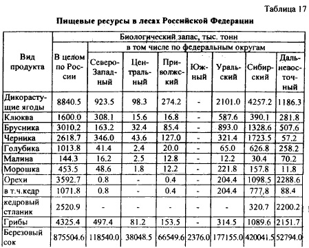 Недревесные ресурсы и услуги леса, их использованиеВажное значение имеют недревесные лесные ресурсы, использование лесов в целях ведения охотничьего хозяйства и другие виды прижизненного использования лесов. По расчетным данным, биологический запас основных видов ягод (клюквы, брусники, черники) составляет более 7 млн. т, кедрового ореха более 1 млн. т, грибов около 4,3 млн. т (табл. 17).