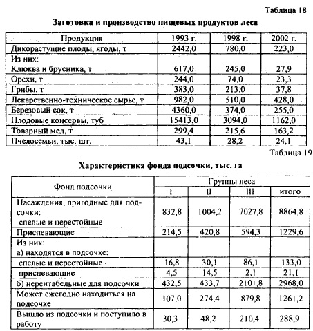 Промысловые запасы перечисленных видов ресурсов принимаются равными 50% от биологических. По экспертным оценкам, рыночная стоимость образующегося ежегодно промыслового запаса дикорастущих ягод превышает 10 млрд. долл. США. Стоимость промыслового запаса грибов оценивается примерно в 5 млрд. долл. США. Из дикорастущих орехоплодных пород наиболее важное значение имеет кедр. Кедровые леса занимают в Российской Федерации около 40 млн га. Кедр (сосна кедровая сибирская) важнейшая лесообразующая порода западносибирской, восточносибирской и дальневосточной тайги. Для максимального сохранения при лесозаготовках кедровых лесов как базы орехового промысла с 1953 г. начали выделять орехопромысловые зоны с исключением их из эксплуатационных лесов и запрещением рубок главного пользования. В 2002 г. в орехопромысловые зоны выделено более 10,6 млн га лесов. В горных районах Восточной Сибири и Дальнего Востока распространены заросли кедрового стланика. Они занимают около 25 млн га. Ценный пищевой продукт леса грибы. Это большая группа низших растений, насчитывающая более 30 тыс. видов. На территории Российской Федерации произрастает около 3 тыс. видов шляпочных грибов, из них более 200 видов съедобные. Один из важных видов недревесной продукции леса березовый сок. В России произрастают около 40 видов березы, однако для промышленной добычи березового сока используют, главным образом, березу повислую и пушистую. Согласно Основным положениям об осуществлении побочных лесных пользований в лесах Российской Федерации заготовка древесных соков допускается на участках спелого леса, подлежащего рубке главного пользования, не ранее чем за 5 лет до рубки. В бореальных лесах Российской Федерации, к которым относятся и леса, произрастающие на вечной мерзлоте, в азиатской части России (80% площади лесного фонда), имеющих низкую производительность по древесине, произрастает около 200 видов деревьев, кустарников, кустарничков и травянистых растений, плоды которых можно использовать в пищу. При этом леса здесь необычайно богаты недревесными ресурсами, имеющими огромную социальную и экономическую ценность. Велики в этих лесах запасы промысловой дичи, диких животных, пушных зверей. Здесь же произрастают ценнейшие виды лекарственных растений, имеющих повышенный спрос как у нас в стране, так и за рубежом (женьшень, элеутерококк, золотой корень, лимонник и т.д.), грибов. Экономическая значимость недревесных ресурсов лесов, произрастающих в условиях вечной мерзлоты, несравненно выше растущей здесь древесины. Использование недревесных ресурсов леса занимает важное место среди других видов использования лесных ресурсов. К нему относится заготовка недревесных сырьевых ресурсов, включающих пищевые, лекарственные, технические, медоносные и кормовые растительные ресурсы. Анализ объемов заготовок дикорастущих продуктов леса показывает, что использование недревесной продукции леса по многим показателям ниже среднегодовых за многолетний период наблюдения. Сравнение данных о заготовке пищевых продуктов леса за многолетний период времени с их средним запасом, возможным для промышленного освоения, показывает, что пищевые ресурсы леса в Российской Федерации используется более чем недостаточно. Объемы заготовок и производства пищевых продуктов леса лесхозами М