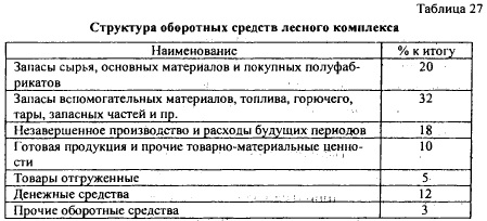 Соотношение отдельных составных частей оборотных средств, выраженное в процентах к общему итогу, представляет собой их структуру. Анализ структуры имеет большое значение для осуществления мероприятий по экономической эффективности производства, определению путей улучшения использования оборотных средств, обеспечению необходимого ритма производства. Для организаций лесного комплекса характерна такая структура оборотных средств, при которой около 75% их находится в сфере производства. Ниже приведена структура оборотных средств лесного комплекса.