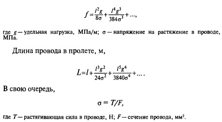 Приведенные уравнения справедливы для любых пролетов, в том числе и очень длинных. Для пролетов с длиной, обычной в практике сооружения сельских воздушных линий, с достаточной точностью можно пользоваться этими уравнениями, отбросив последние члены в правой части.